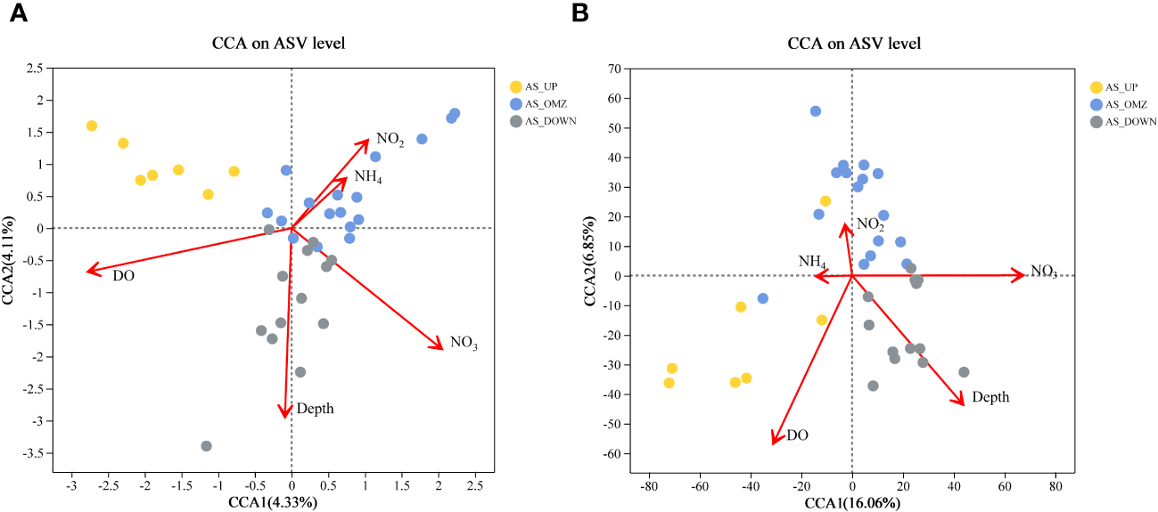 The results showed that environmental parameters including DO, depth, NO3-, and NO2- exhibited significant influences on bacterial and archaeal communities. DO, depth, and nitrate were the most significant environmental factors. For bacterial communities in AS, the first two ordination axes of CCA accounted for 8.44% of the explained total variance in ASV level (Figure 7, Supplementary Table 2). CCA indicated that among the five different parameters, DO seemed to separate the bacterial communities into ‘oxygen content’ and OMZ communities (Figure 7). For archaeal community in AS, the first two ordination axes of CCA accounted for 16.06% and 6.85% of the explained total variance in ASV level. Similar to bacterial, archaeal samples in AS_OMZ was negatively correlated with DO. The archaeal communities in group AS_DOWN was strongly influenced by depth. Besides, NO2- and NH4+ had a small impact on the archaeal community (Figure 7).