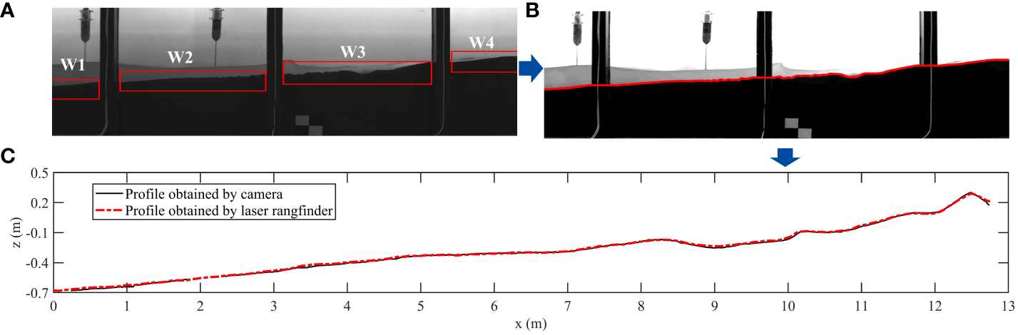 The photos taken by the PointGrey cameras are grayscale images (only black and white), with grayscale values ranging from 0 to 255, and a resolution of 2048×2048 pixels. The three cameras can be synchronized using a multi-camera acquisition system, with a maximum acquisition frequency of 60Hz. In this experiment, a shooting frequency of 10Hz was used, which can meet the observation requirements for profile and water surface changes. The process of profile identification is shown in Figure 2. Firstly, select the area to be identified in the image (red box), then adjust the brightness of the image to identify the beach profile. Finally, the identified beach profile is calibrated using a grid board and compared with data from a laser rangefinder. The maximum difference in elevation of the sand bar identified by image recognition can be controlled within 0.5 cm.