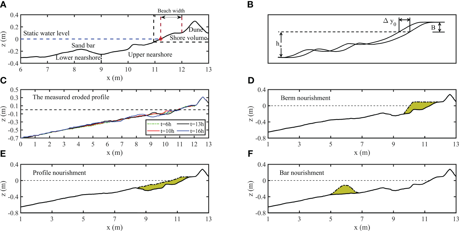 The different parameters of the nourished beach used in the following sections are shown in Figure 3A. Three beach nourishment methods (berm nourishment, profile nourishment, and bar nourishment) were presented in this study (Atkinson and Baldock, 2020; Larsen et al., 2023). The berm nourishment involved extending the beach berm towards the sea by replenishing sand ranging from x = 9.65 m to x = 11.84 m (Figure 3D). The edge of the beach berm moved 1.52 m towards the sea, the slope of the beach toward the sea was 1/2 after sand replenishment, and two-thirds of the replenished sand was above the mean water level. The replenished sediment in profile nourishment in this experiment was located mainly within the upper nearshore (x = 8.42 - 11.76 m), the edge of the beach berm extended 0.5 m to the sea, and the slope of the beach toward the sea was 1/10 (Figure 3E). There was no apparent sandbar in profile nourishment as the furthest sand replenishment extended to the crest of sandbar. Bar nourishment, as shown in Figure 3F, was an artificial sandbar formed by replenished sediment from x = 4.9 to x = 6.8 m, which was located on the seaward side of the original topographic sandbar. The slope on both sides of the sandbar is 1/4, and the height of the artificial bar was about 0.2 m.
