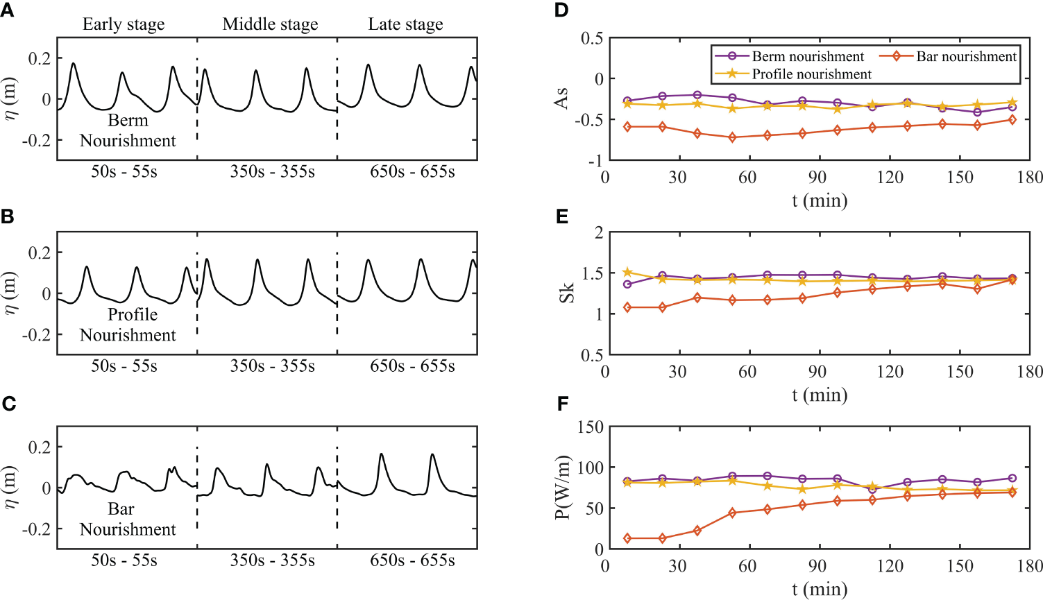 (A-C) Typical wave shapes during three different time periods in beach nourishment methods. (D) Wave asymmetry. (E) Wave skewness. (F) Wave energy flux P.