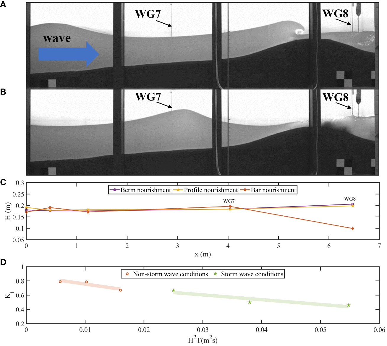 Figure 5 (A) Before the wave breaking in the bar nourishment. The blue arrow indicates the direction of the incident wave. (B) After the wave breaking in the bar nourishment. (C) Average wave heights from wave gauges for different beach nourishment methods during storms. (D) The transmission coefficient in bar nourishment cases(Case A3, A4, A5, B1, B2, and B3 with the same wave period).