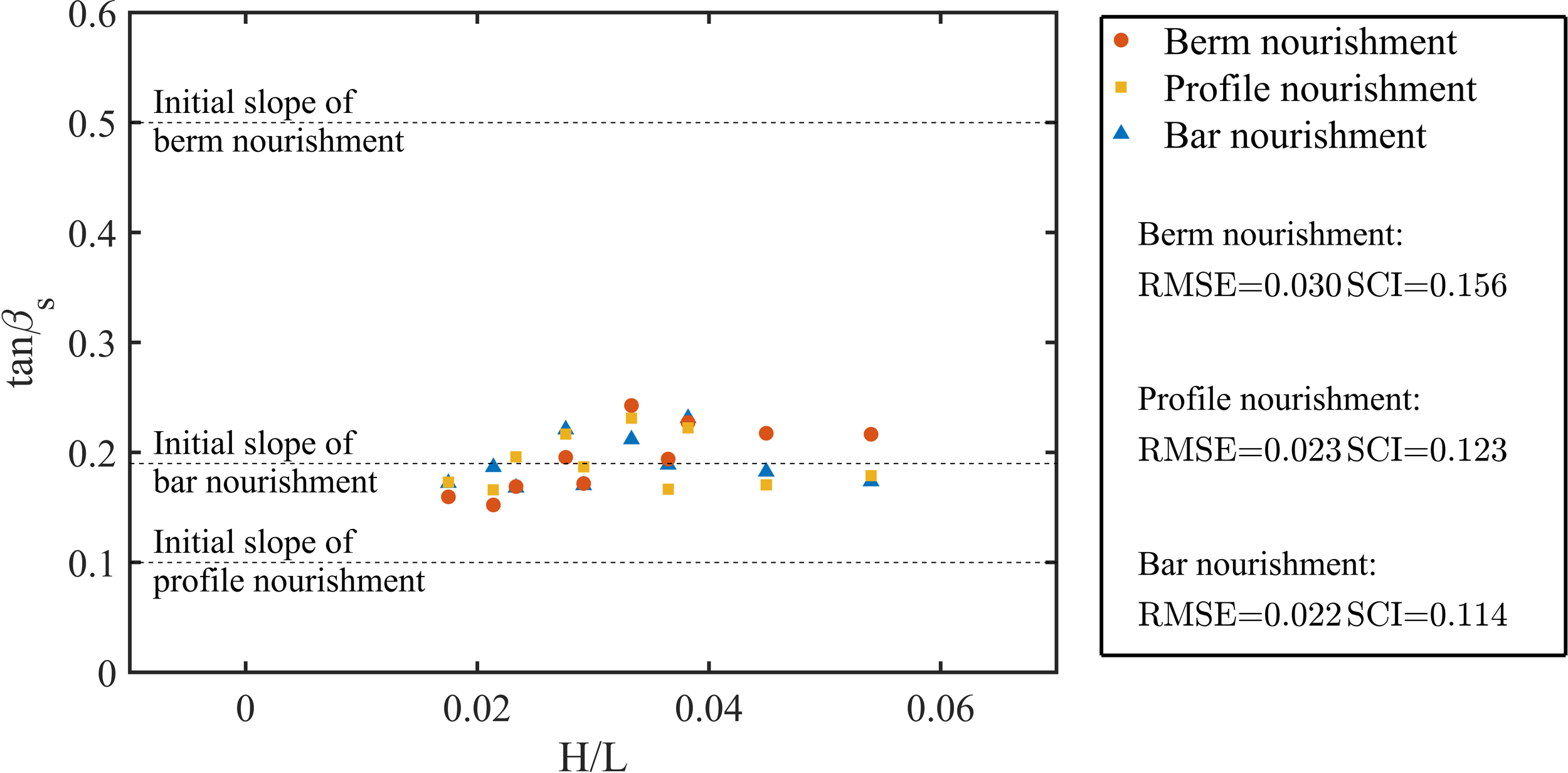 From Figure 7, it can be observed that the slope of the swash zone remained constant after the bar nourishment, with a value of approximately 0.19, which is the same as the slope of the eroded profile. For berm nourishment, the slope of the swash zone decreases from 0.5 to approximately 0.19, while for profile nourishment, the slope increases from 0.1 to approximately 0.19. Based on Equations 8 and 9 , when comparing the three beach nourishment methods, it's evident that berm nourishment yields the highest discrete value relative to the reference value of 0.19 (RMSE = 0.03, SCI = 0.156). Following this, profile nourishment exhibits a slightly lower discrete value (RMSE = 0.023, SCI = 0.123), and sandbar nourishment shows the lowest discrete value (RMSE = 0.022, SCI = 0.114). The underlying cause for this phenomenon is that, during berm nourishment, the majority of the feed sand is deposited within the swash zone. Under non-storm wave conditions where the wave steepness (H/L) is less than 0.03, the slope of the swash zone for berm nourishment is marginally smaller than that for profile nourishment. However, under storm wave conditions with wave steepness greater than 0.03, the slope of the swash zone for berm nourishment is slightly larger than that for profile nourishment. Based on the experimental observations, it can be inferred that the slope of the swash zone after sand replenishment with the same grain size of sand will eventually approach a constant value, which is the slope of the eroded beach. This is because the properties of the sediment itself dominate the formation of the slope of the swash zone after sand replenishment, while the nourishment method or incident wave conditions have minimal influence on the slope of the swash zone.