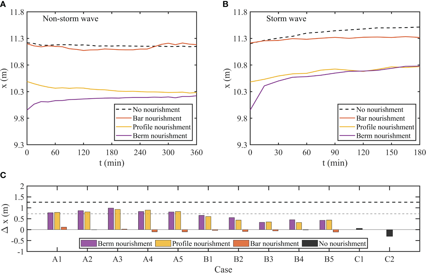 Shoreline position in four cases: no nourishment (black dashed line), bar nourishment (red line), profile nourishment (yellow line), and berm nourishment (purple line). (A) Non-storm wave case: H = 0.06 m, T = 1.6 s. (B) Storm wave case: H = 0.185 m, T = 1.6 s. (C) The added beach width of three beach nourishment methods after different wave actions (Positive values represent the increasing width of the beach seaward). When sediment feed is complete, the dashed black line represents the increased beach width in the berm nourishment, and the dashed gray line represents the increased beach width in profile nourishment. In the Y-axis, where x represents the position of the shoreline, and Δx represents the added beach width.