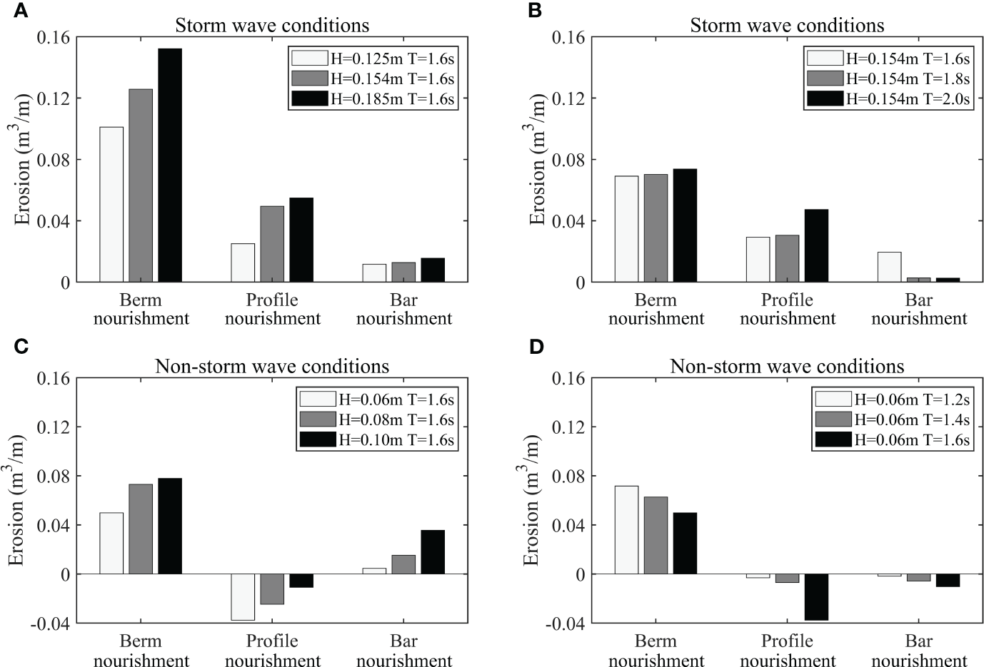 Single-width erosion of sand replenishment at different locations under different wave heights and wave periods. (A) Same period, different wave heights under storm conditions. (B) Same wave height, different periods under storm conditions. (C) Same period, different wave heights under non-storm conditions. (D) Same wave height, different periods under non-storm conditions. Positive values indicate erosion status, while negative values indicate accumulation status.