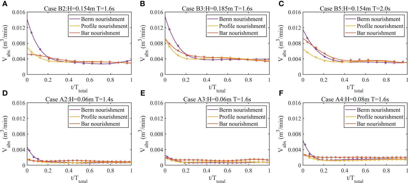 The absolute mass Vabs is used to evaluate the rate of beach profile change under three beach nourishment methods: