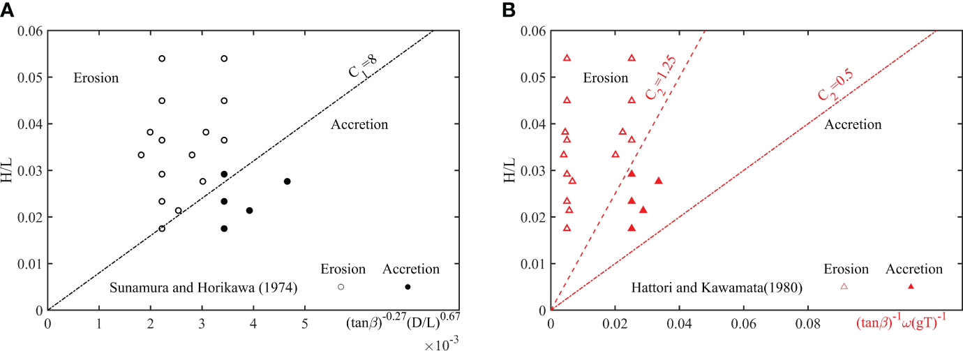 The focus of the research is on the changes in the profile and hydrodynamic conditions of nourished beaches at different locations, particularly in exploring sediment transport in nearshore areas, with the requirement that wave conditions satisfy the similarity of sediment movement. This experiment references the hydrodynamic conditions of the Wampiakou Beach area in Rizhao, and follows the principles of Froude similarity, making its findings more applicable to beaches within Shandong Province. The issue of scale effects in beach experiments cannot be ignored, and it is necessary to consider the key factors that influence the experiment results. Therefore, this research primarily examines shoreline retreat and changes in beach volume. Previous research has demonstrated consistent findings regarding the retreat of the shoreline at different scales, confirming geometric similarity and volume conservation in laboratory-scale experiments (van Rijn, 2011; Atkinson et al., 2018). However, using unscaled sediments in the experiment leads to steeper profiles at smaller scales. Additionally, large settling velocity weakens offshore sediment transport and reduces the sediment transport rate (Vellinga, 1982; Larsen et al., 2023). To address these effects, Equation 3 from Sunamura and Horikawa (1974) is applied to differentiate between erosive and accretive beaches.