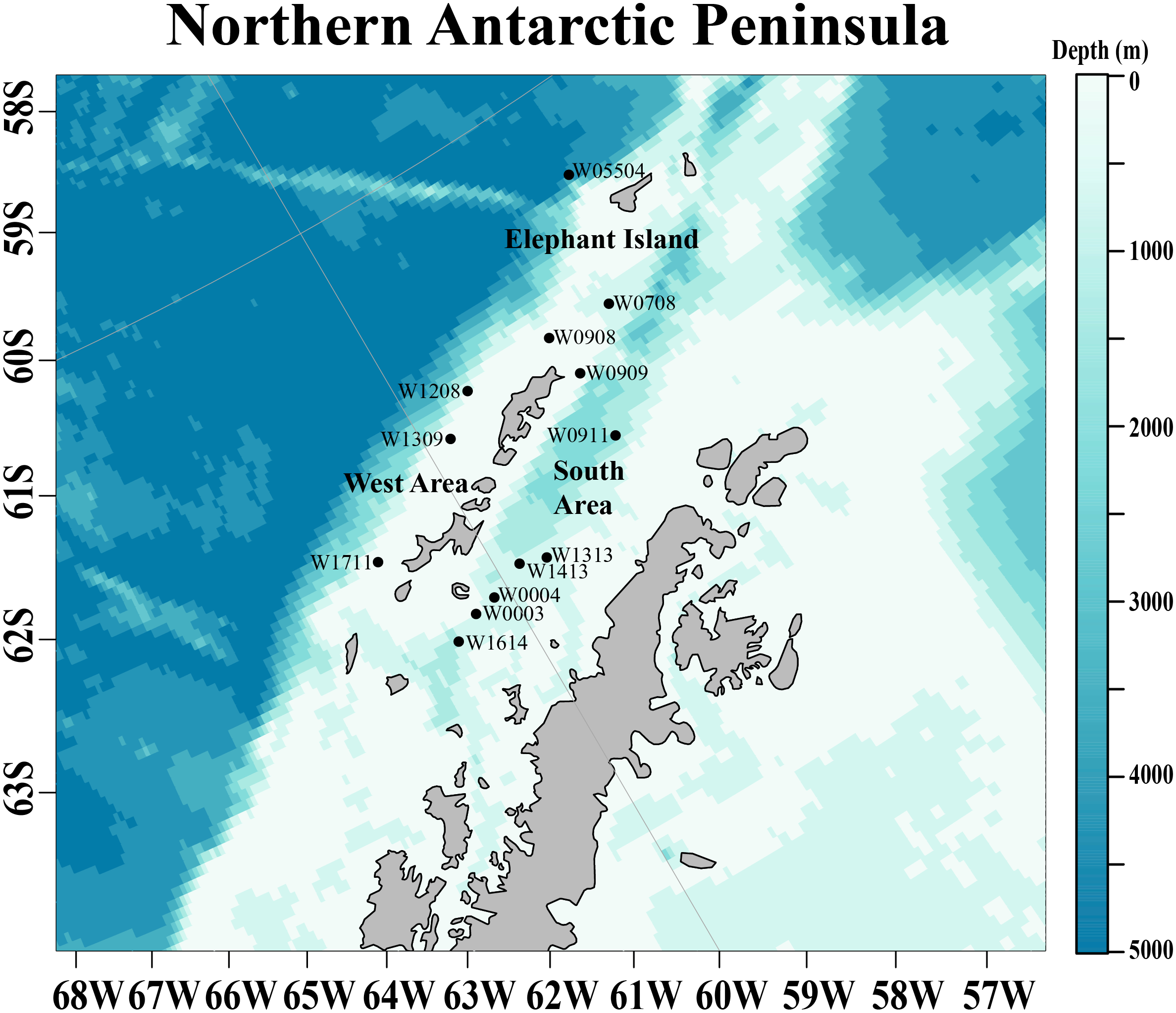 The study area at the northwestern Antarctic Peninsula (nAP) where krill were collected in one of three regions: Elephant Island, the West, or the South Area from 2012 to 2016. Sampling stations are represented by points with their corresponding station names shown.