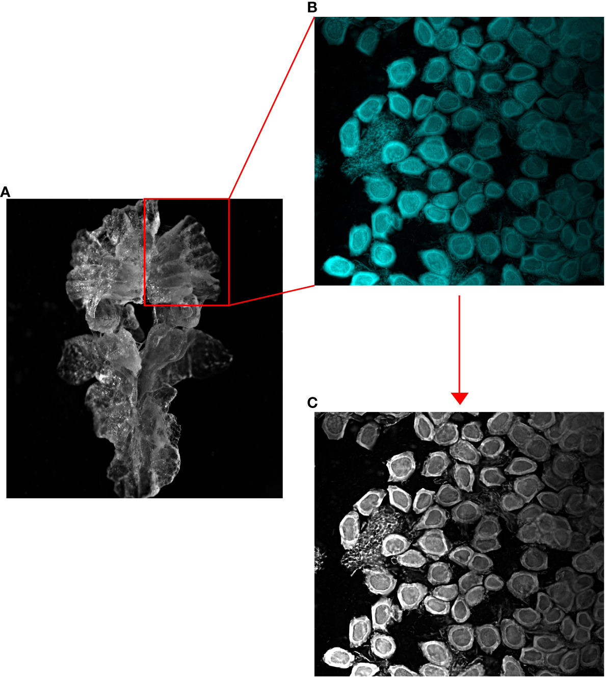 Microscope images of (A) an entire female krill ovary, (B) a lobe of the ovary stained with DAPI and subsequently squashed, and (C) a greyscale image of the fluorescently dyed ovarian section.