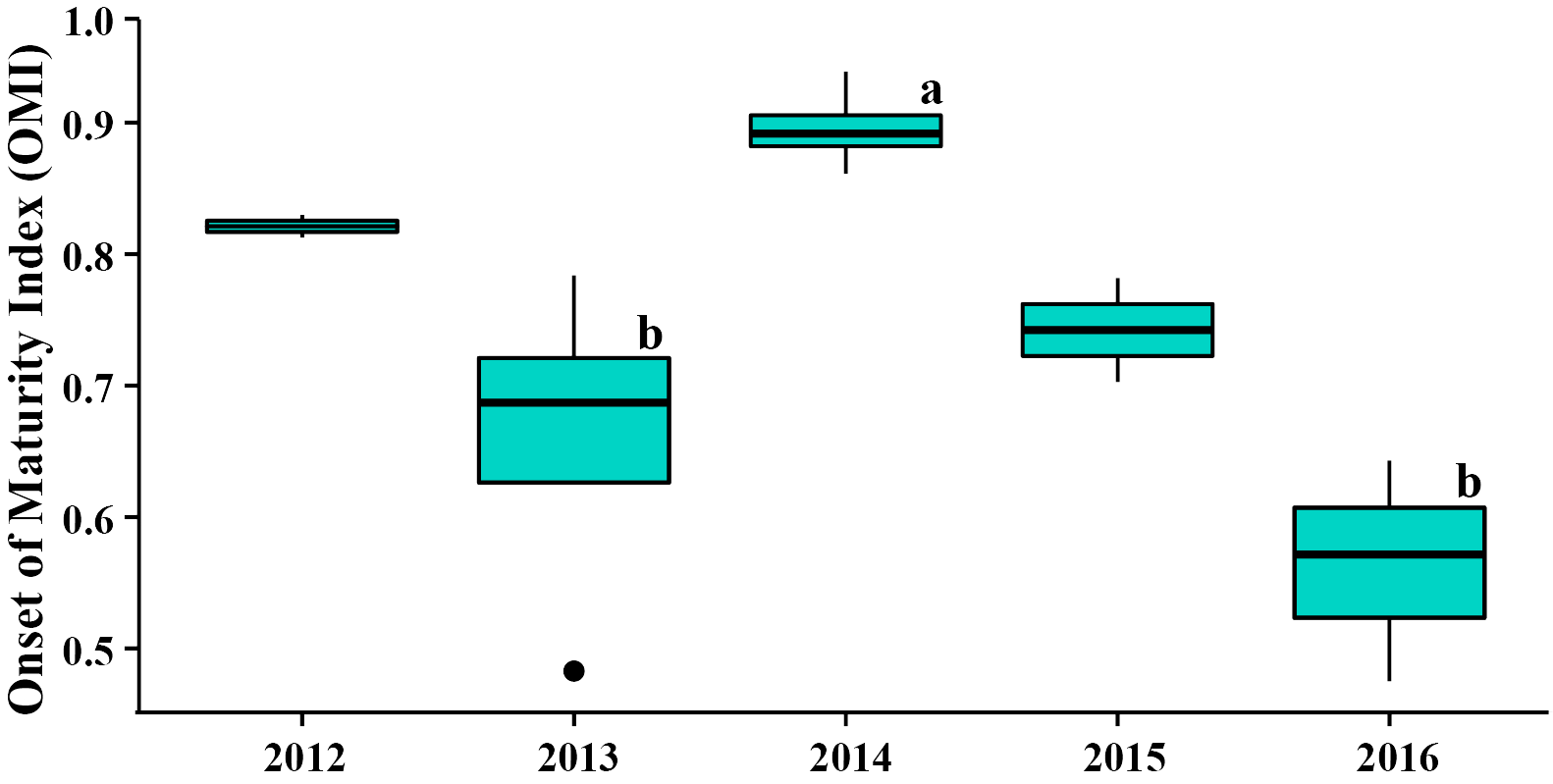 The Onset of Maturity Index (OMI) of female krill during the austral winter from 2012 to 2016 at the northwestern Antarctic Peninsula (nAP). Letters above 2013, 2014, and 2016 indicate significant differences between the years, as determined by the ANCOVA and post-hoc Tukey’s honestly significant difference (HSD) test. The OMI in 2012 and 2015 are also shown, however they were not included in the ANCOVA and cannot be considered when assessing interannual differences.