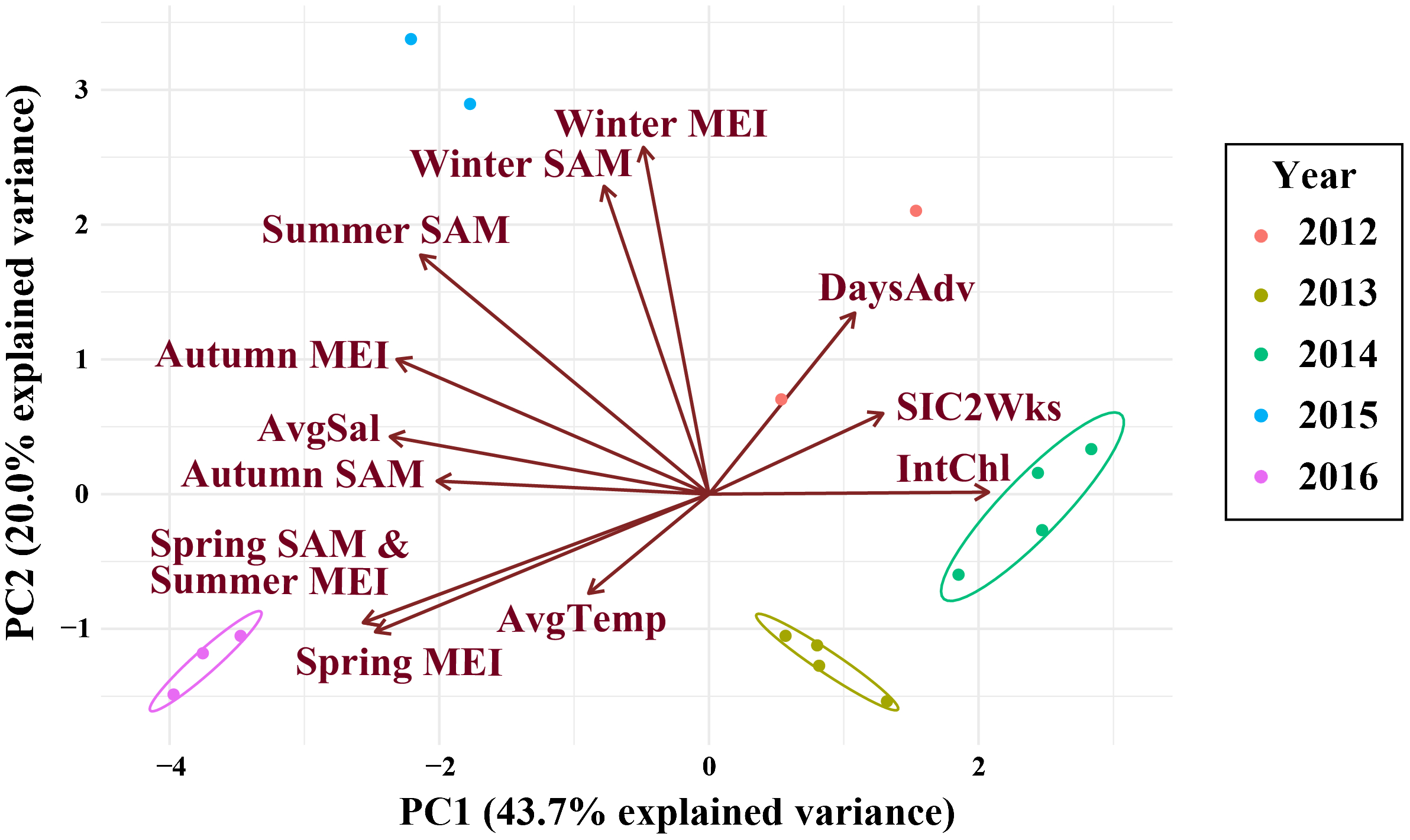 The PCR for the climate and environmental variables of interest at the northwestern Antarctic Peninsula (nAP) from 2012 to 2016. Variables included: the spring, summer, autumn, and winter Southern Annular Mode (SAM) and Multivariate El Niño Index (MEI), average salinity (AvgSal; PSU), integrated chl-a (IntChl; mg m-2), the average sea ice coverage at the sampling station two weeks prior to each sampling event (SIC2Wks), and the number of days between the date of sea ice advance and the sampling date each year (DaysAdv). Years are color-coded and the ellipses are drawn around data that are more similar. No ellipses were drawn around data from 2012 and 2015 because there were two few data points in each year to accurately group the data.