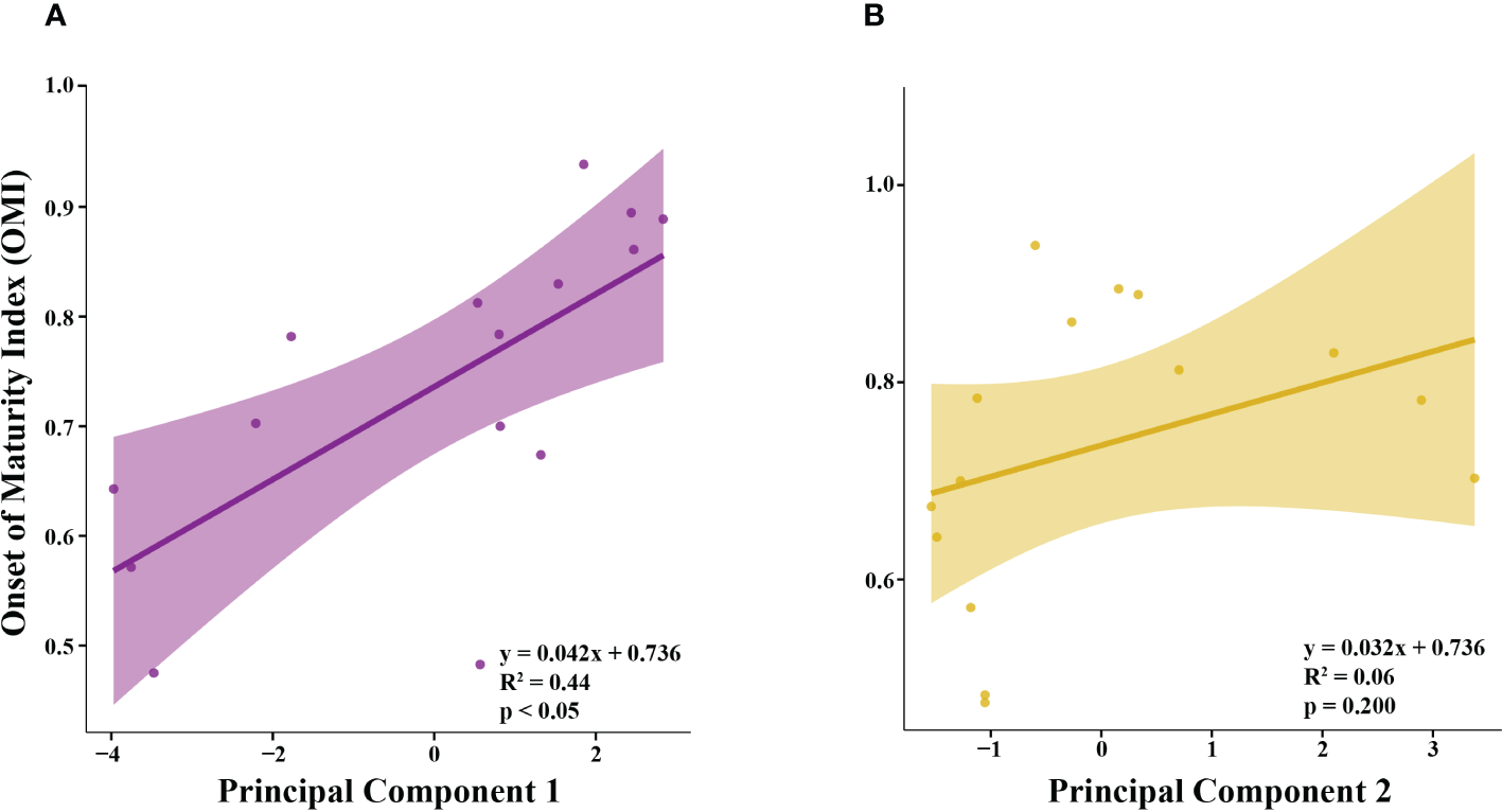Our second hypothesis was that OMI would be positively correlated with climate and environmental conditions that encourage high food availability leading up to and during the winter. To test this, we used principal component regression (PCR) to reduce the climate (seasonal SAM and MEI) and measured environmental (IntChl, SIC2Wks, DaysAdv, AvgTemp, and AvgSal) variables, characterize the conditions at the nAP in each year, and test for significant relationships between OMI and the first and second principal components (PC1 and PC2). PCR is a statistically robust regression technique that is based on principal component analysis (PCA) and is used to estimate the relationship between principal components in a PCA and a dependent variable using a standard linear regression model (Agarwal et al., 2019). For this analysis, we used data collected during all five years of our study (2012 to 2016). Seasonal indices of SAM and MEI were included in the PCR because their phases can impact krill condition, reproduction and recruitment (Saba et al., 2014; Steinke et al., 2021). SIC2Wks and DaysAdv were included in the PCR because sea ice concentration and the timing of sea ice advance can impact chl-a content and krill dynamics at the Antarctic Peninsula (Nicol, 2006; Veytia et al., 2021). IntChl is a proxy for phytoplankton biomass (Garibotti et al., 2003) and was included in the PCR because of its established correlation with female krill reproductive development (Quetin and Ross, 2001). AvgTemp was included in the PCR because it can impact the growth and development of Antarctic krill with higher temperatures often resulting in enhanced growth rates (Brown et al., 2010). AvgSal was included in the PCR because of its ability to reflect changes in sea ice and climate patterns (Hellmer et al., 2011; Reiss et al., 2020). We included seasonal climate phases for SAM and MEI, sea ice dynamics leading up to the time of sampling, and measurements of local environmental conditions at the time of sampling in the PCR. Local environmental variables measured at the time of sampling provide only a snapshot of what krill are exposed to, while climate and environmental conditions that occur over longer timescales leading up to and throughout the winter may help us infer what krill are seasonally exposed to. Due to the varying scales of the variables of interest, data included in the PCR were normalized prior to running the analyses. All statistical tests were performed in RStudio 2022.07.01 (RStudio Team, 2022).