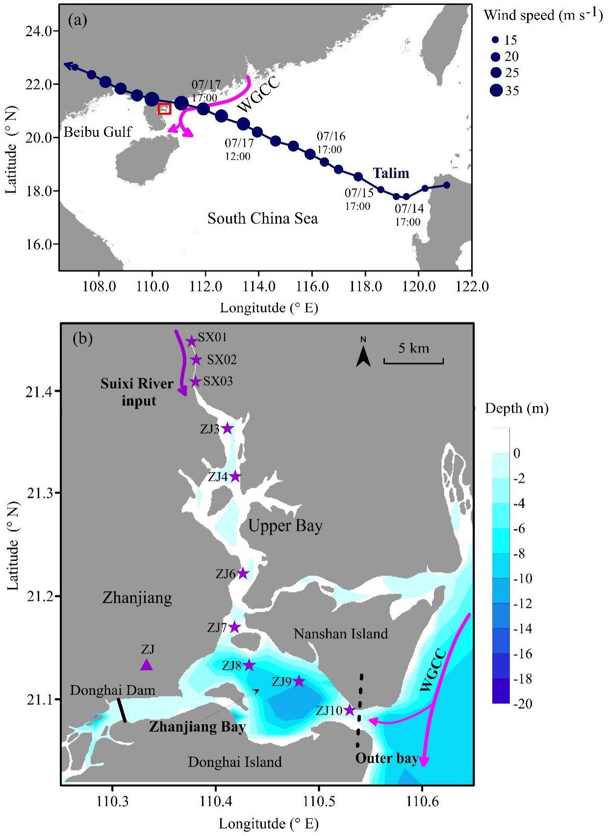 The track of Typhoon Talim (dark blue dotted line) (A) and the sampling stations (dark pink star) in Zhanjiang Bay (B). The red box in (A) is the study area. The dark pink triangle in Zhanjiang city is the location of rainwater sampling point. The three stations in the Suixi River were obtained from Chen et al. (2024). The pink arrows represent the West-Guangdong Coastal Current, which was modified from the study of Lao et al., 2022b and 2023c.