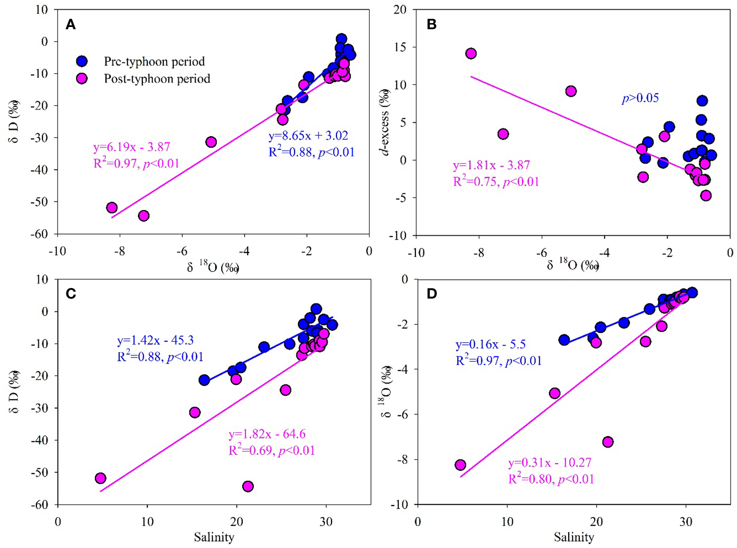 (A–D) Linear relationship of δD-δ18O, d-excess–δ18O, δD-salinity and δ18O-salinity in Zhanjiang Bay during the pre- and post-typhoon periods.