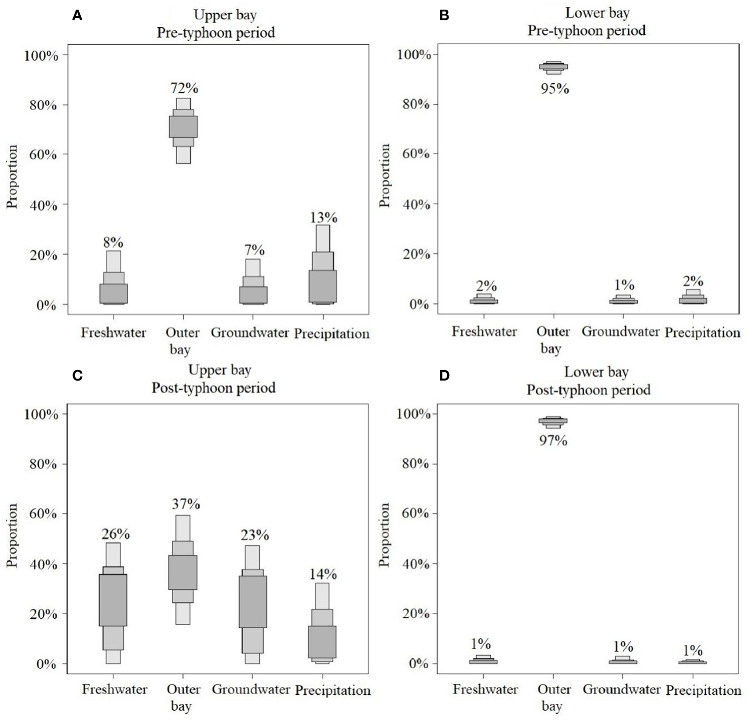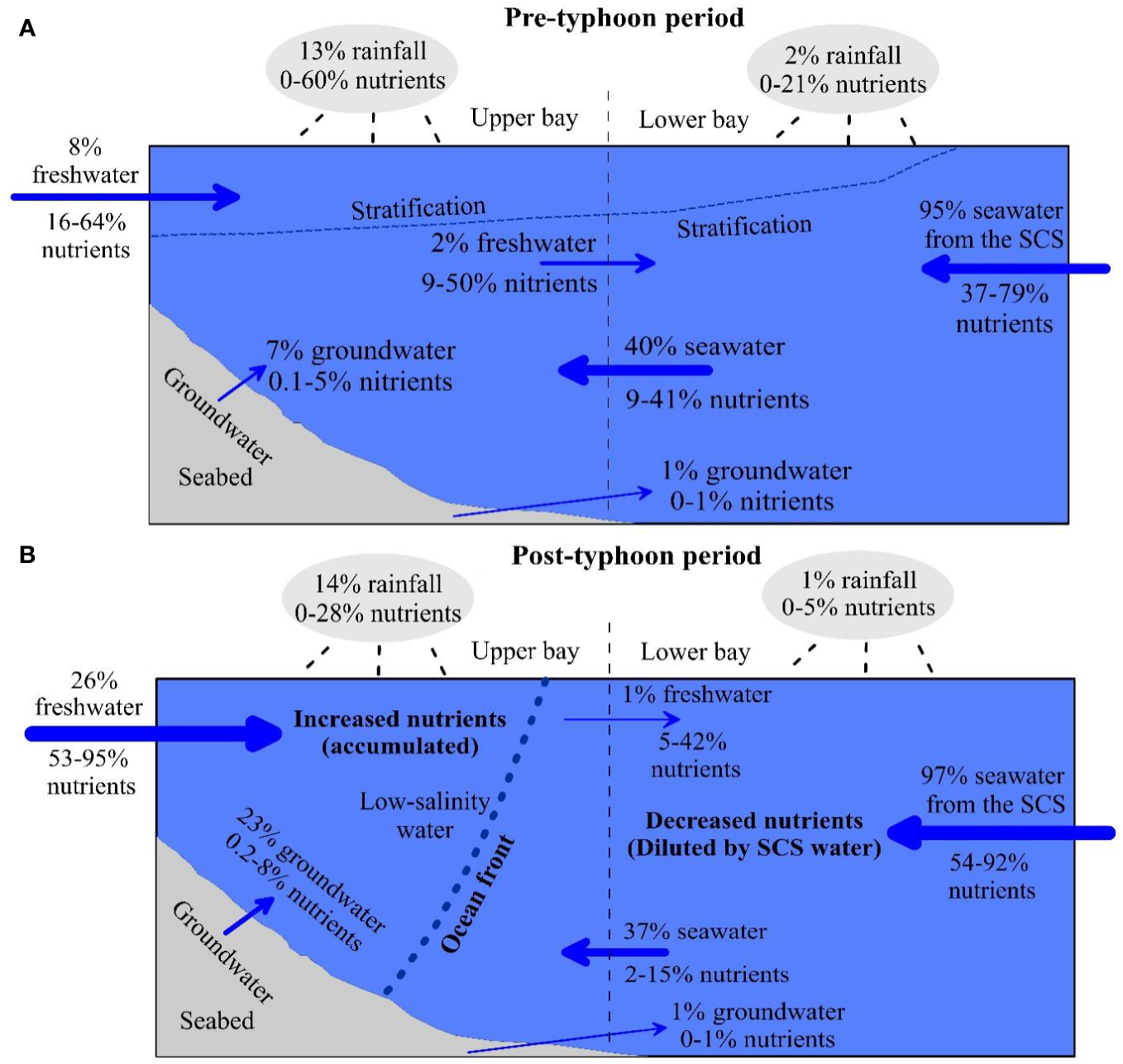Lao Q. Lu X. Chen F. Jin G. Chen C. Zhou X. et al . (2023b). Effects of upwelling and runoff on water mass mixing and nutrient supply induced by typhoons: Insight from dual water isotopes tracing. Limnol. Oceanogr.68, 284–295. doi: 10.1002/lno.12266