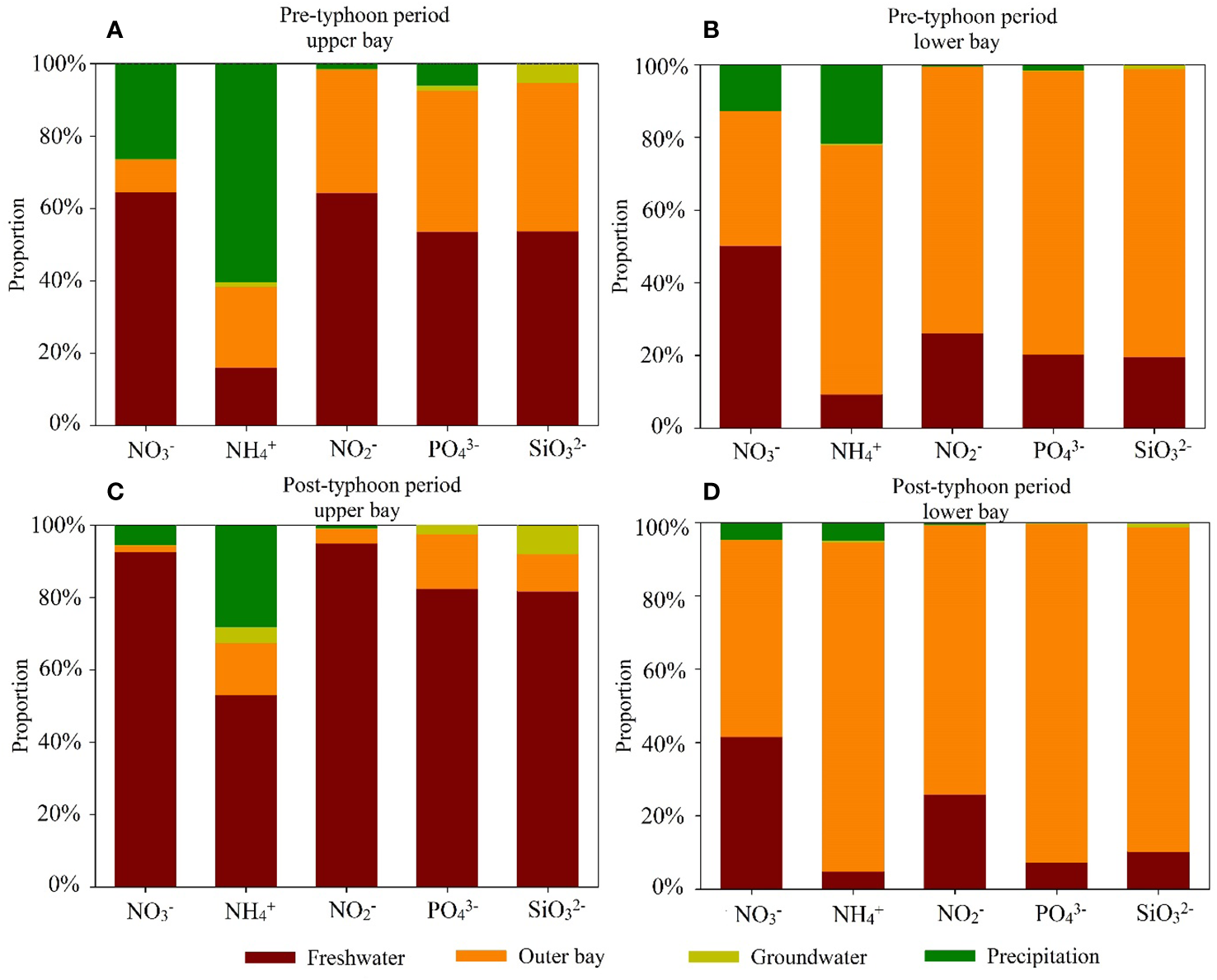 Before the typhoon, the concentrations of NO2-, NO3-, NH4+, PO43-, and SiO32- ranged from 0.6 to 5.2 μmol L-1, 1.6 to 46.6 μmol L-1, 3.9 to 21.0 μmol L-1, 0.3 to 4.1 μmol L-1 and 10.0 to 61.8 μmol L-1, respectively. They all exhibited higher concentrations at the top of the upper bay (station ZJ3), gradually decreasing toward the lower bay with increasing salinity. This indicated the influence of terrestrial nutrient input in the bay. In addition, there is no significant difference in nutrient concentration between the surface and bottom layers during the pre-typhoon period (t-test, p>0.05). However, except for the NO2-, the nutrient concentrations increased remarkably in the bay during the post-typhoon period, particularly in the upper bay (Figure 3). After the typhoon, the concentrations of NO2-, NO3-, NH4+, PO43-, and SiO32- ranged from 0.4 to 4.5 μmol L-1, 1.8 to 70.5 μmol L-1, 3.4 to 42.2 μmol L-1, 0.6 to 5.1 μmol L-1 and 11.5 to 61.3 μmol L-1, respectively. In the upper bay, the concentrations of NO3-, NH4+, PO43-, and SiO32- during the post-typhoon period were 1.7 times, 1.9 times, 1.5 times, 1.3 times, respectively, higher than the pre-typhoon period (Table 3). However, in the lower bay, the nutrient concentrations were decreased during the post-typhoon period compared to the pre-typhoon period (except for PO43-) (Table 3). This further indicated that the intrusion of high-salinity seawater from the outer bay has diluted the nutrients in the lower bay, while the formation of a salinity front in the upper bay caused by the typhoon has retained nutrients in the upper bay (the barrier effect of the front). In addition, the nutrient concentrations in the rainwater during the typhoon period were lower than those in the pre-typhoon period (Table 3), which could be related to the nutrients in the rainwater being diluted by the heavy rainfall during the typhoon period.