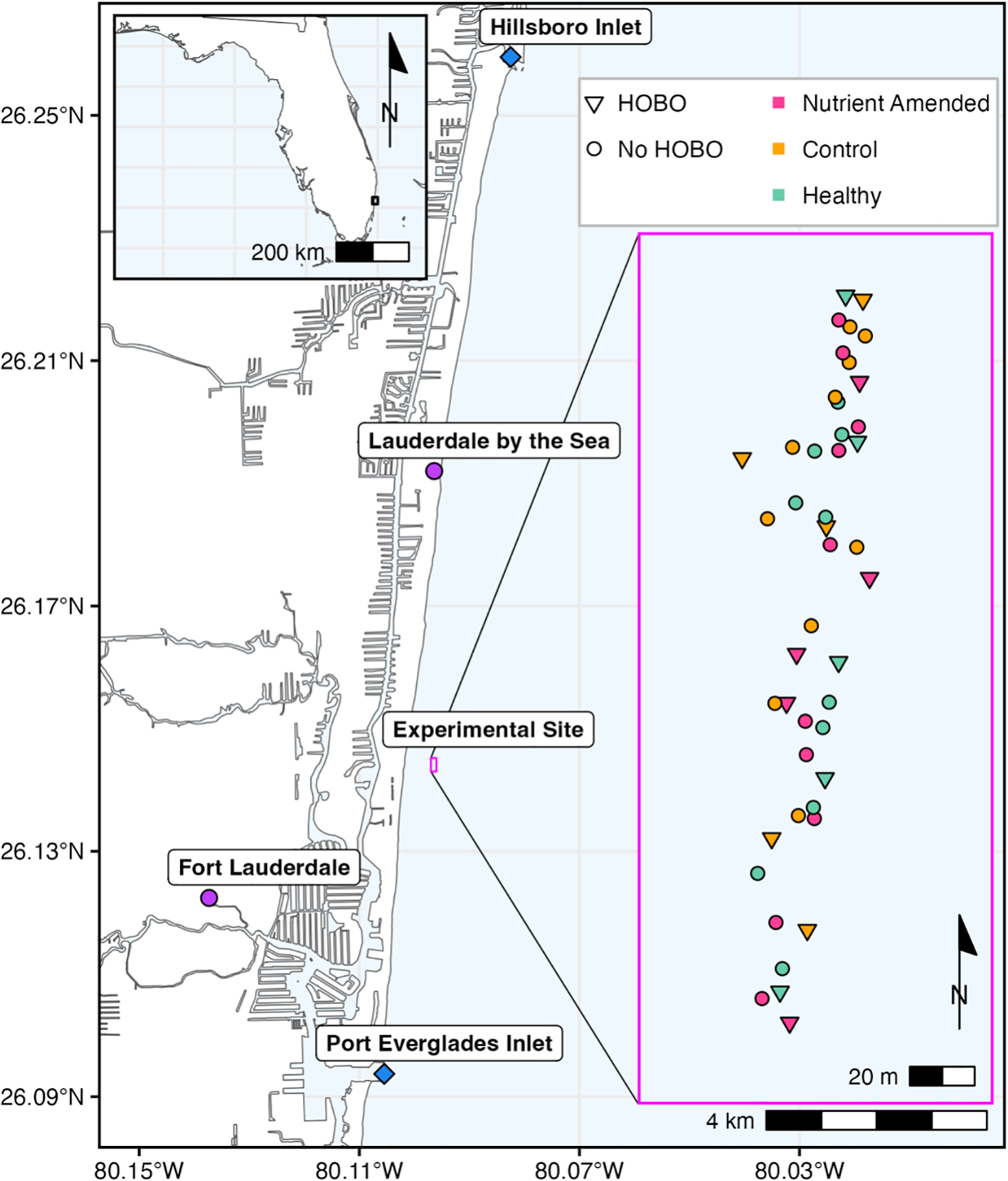 Experimental site, off Fort Lauderdale, FL between the Port Everglades and Hillsboro Inlets (indicated by blue diamonds). The map insert represents the Montastraea cavernosa coral colonies that were tagged and mapped via diver-towed GPS. The red points represent the nutrient-amended colonies (n=15), the orange points represent the control colonies (n=15), and the green points represent the apparently healthy colonies (n=15). The triangles represent the centroid colonies where HOBO loggers were placed, water samples were taken, and disease prevalence surveys were conducted. All colonies were ≥ 3 m apart from one another.