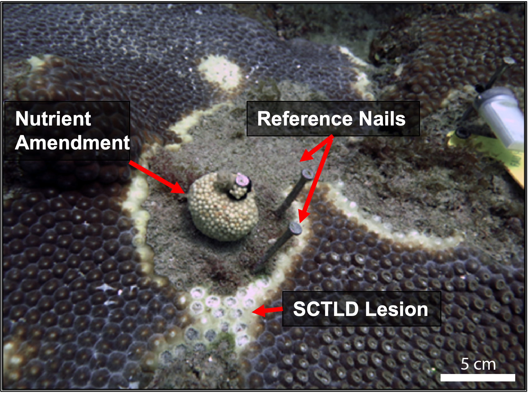 Small nylon mesh packets containing 30g of Osmocote™ 19-6-12 were applied to corals as shown, 5 cm away from an active SCTLD lesion. Reference nails were used to track SCTLD linear lesion progression.