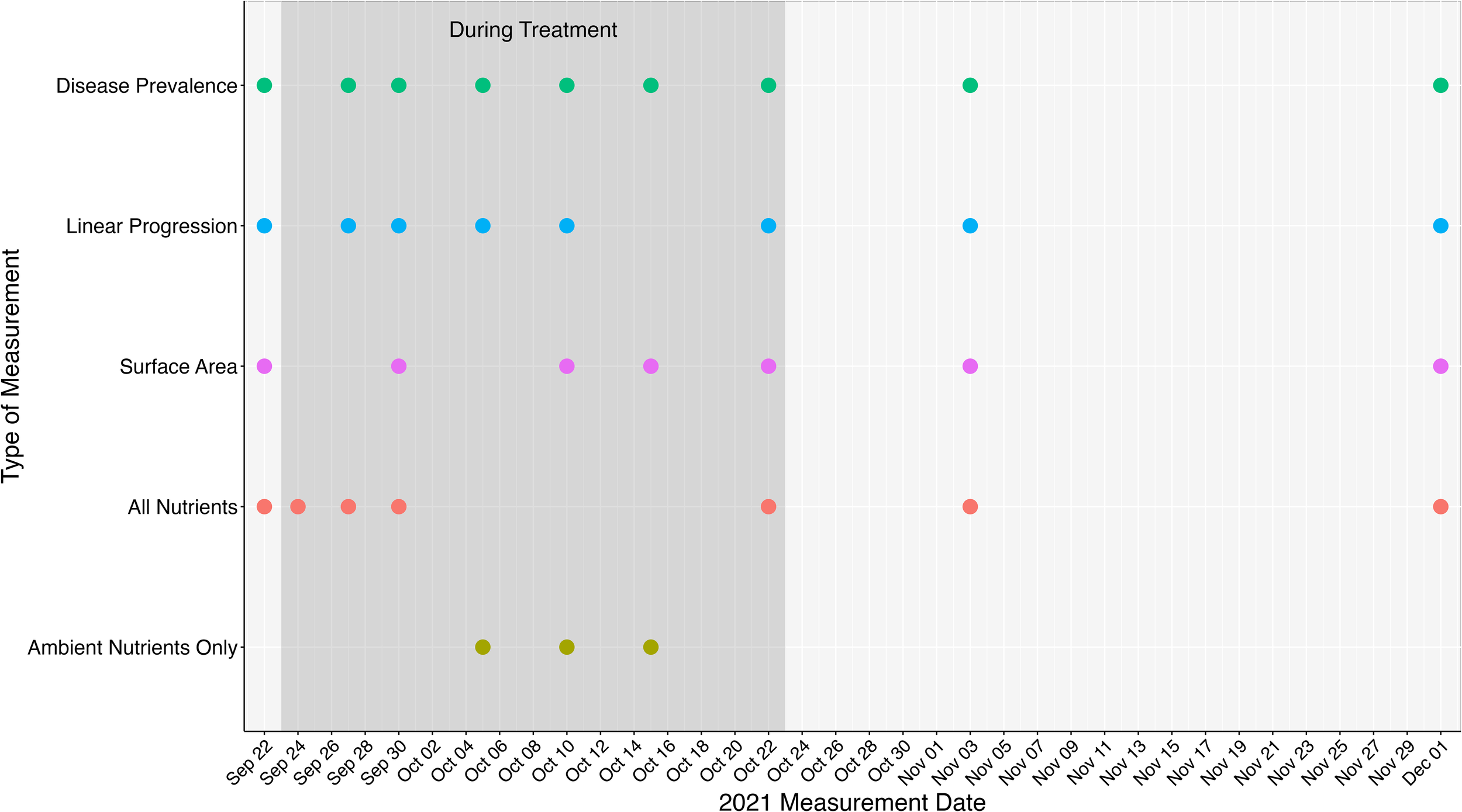 Dates measurements were taken throughout the experiment. The shaded box represents the dates and measurements collected when nutrient amendments were deployed (Sept 24 – Oct 22). Disease prevalence represents the dates disease prevalence surveys were conducted. Linear progression represents the days when nail to lesion measurements were taken. Surface area represents dates when structure from motion photogrammetry was conducted. All nutrients represents when water samples were taken above each experimental group (nutrient-amended, control, and healthy). Ambient nutrients only represent water samples were taken above healthy colonies only.