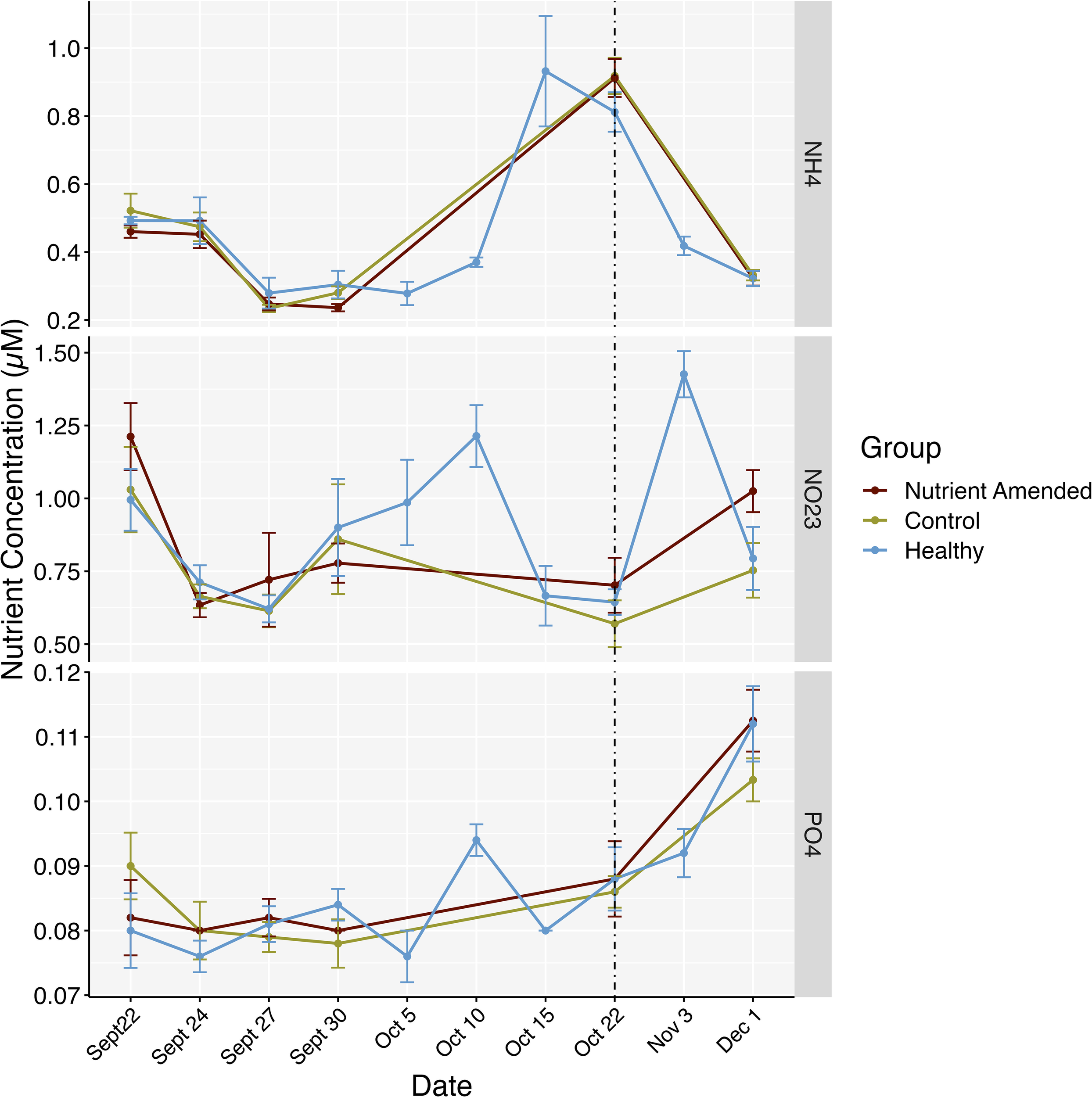 Average nutrient concentrations throughout the experiment from each of the experimental groups on sampling dates. Points represent the average concentrations on the dates when water samples were taken, no samples were taken above the nutrient-amended or control colonies from Oct 5 – Oct 15, 2021. The dotted line represents when nutrients were removed from the reef (Oct 22). Bars represent standard errors.