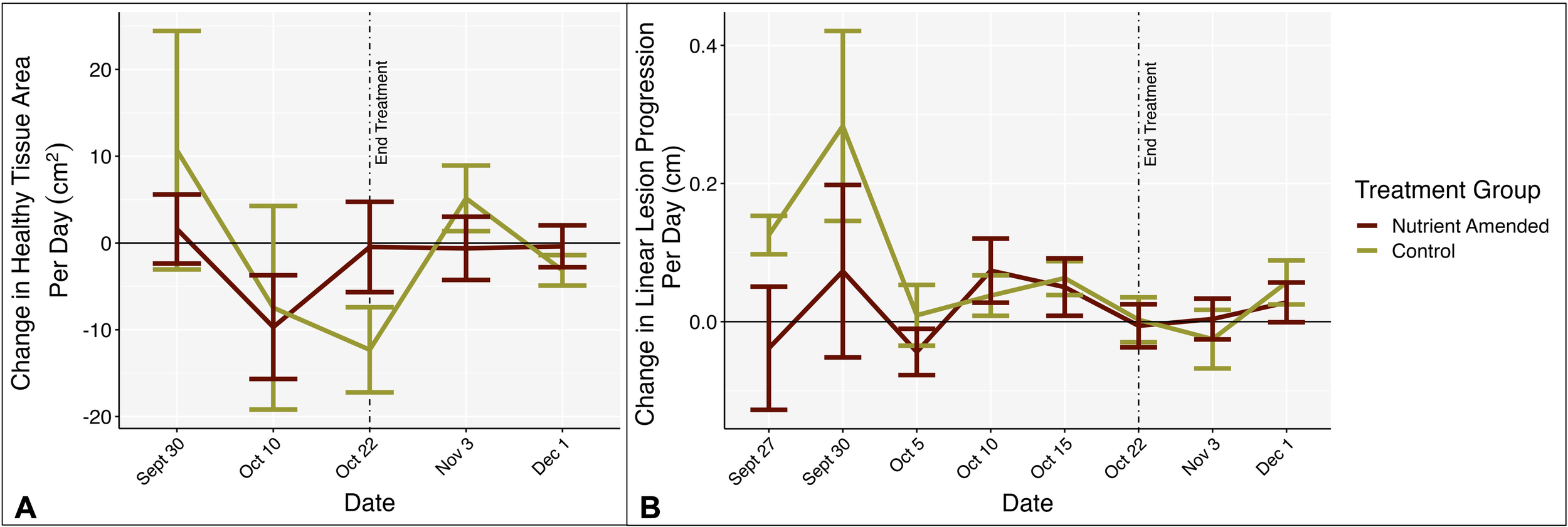 (A) Mean rate of change in healthy tissue area per day (cm2) by treatment group, from SfM photogrammetry. (B) Mean rate of change in linear lesion progression from 5 cm reference nail in cm/day. Negative numbers represent tissue loss and positive numbers represent tissue growth. In both plots the x-axis represents the rate of change between that date and the previous date. End treatment represents the timepoint when nutrient amendments were removed. Bars represent standard error.