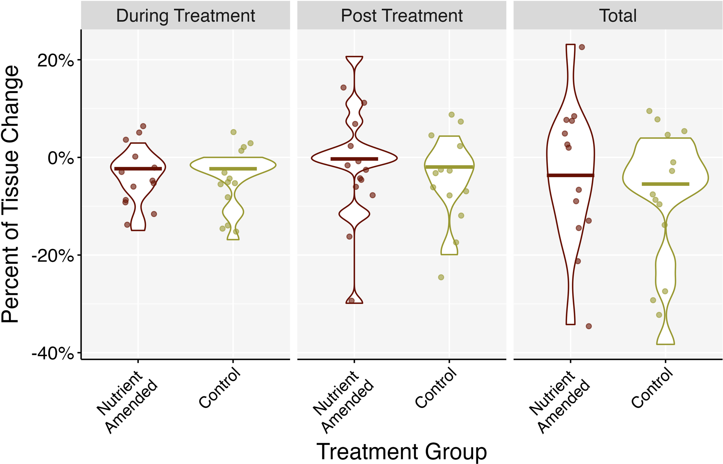 Change in healthy tissue area percentage between experiment and control treatment groups grouped by experimental phase: nutrient amendment (during treatment), once nutrients were removed (post-treatment), and then combined throughout the entire experiment (total). Negative values indicate loss of tissue and positive values indicate tissue growth. Middle bars represent the median.