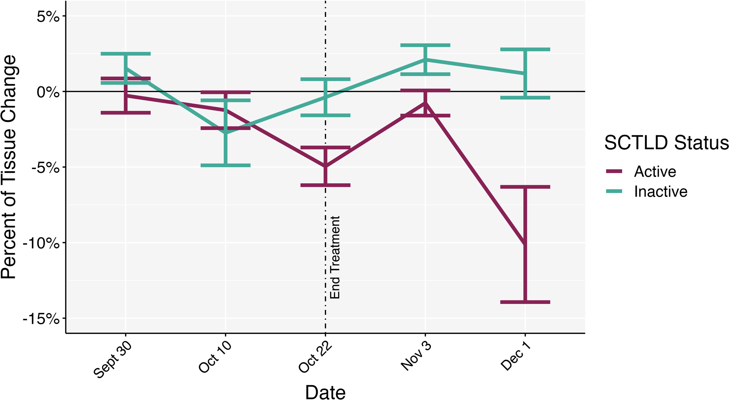 Percentage of change in healthy tissue area across timepoints between active SCTLD colonies and inactive SCTLD colonies. Negative values indicate tissue loss while positive values indicate tissue growth. End treatment represents the date when nutrient amendments were removed. Error bars represent standard error.