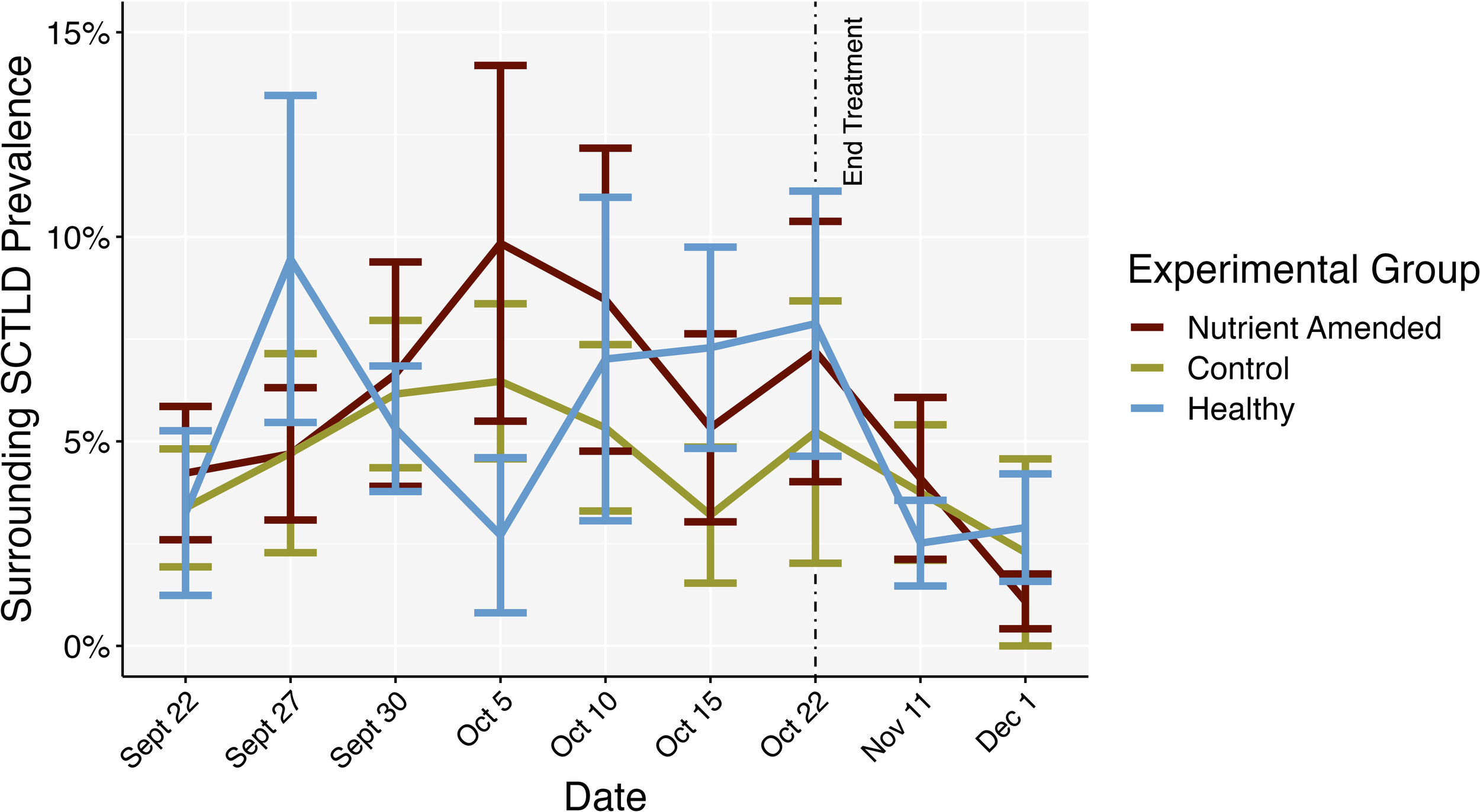 Mean SCTLD prevalence over time surrounding the centroid colonies of the experimental groups: nutrient-amended SCTLD-affected (nutrient-amended), unamended SCTLD-affected (control), and apparently healthy (healthy) colonies. End treatment represents the timepoint when nutrient amendents were removed. Error bars represent standard error.