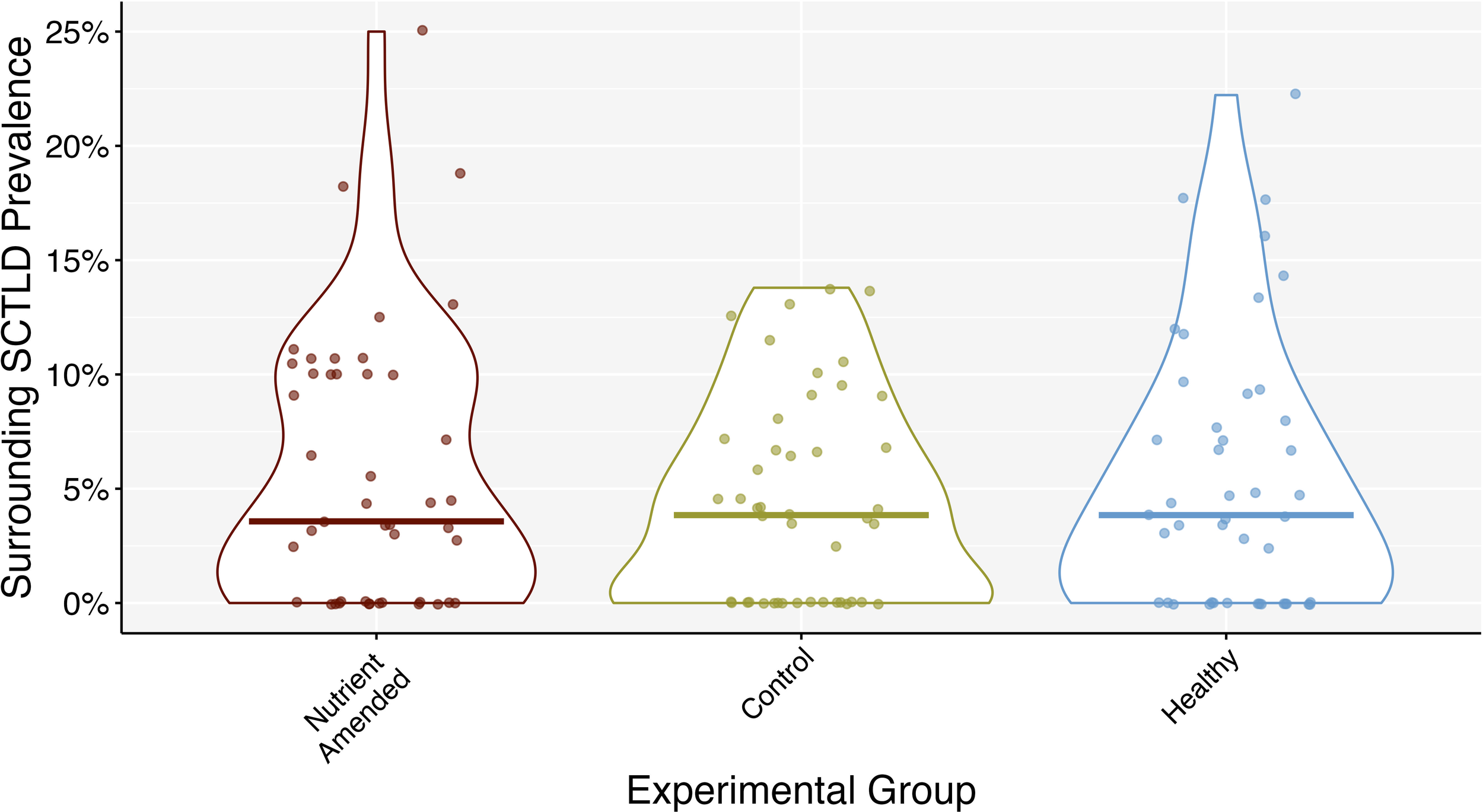 Surrounding SCTLD prevalence throughout the entire experiment grouped by experimental group: SCTLD-affected amended with nutrients (nutrient-amended), SCTLD-affected with no nutrient amendment (control), and apparently healthy coral colonies. Middle bars represent the median.