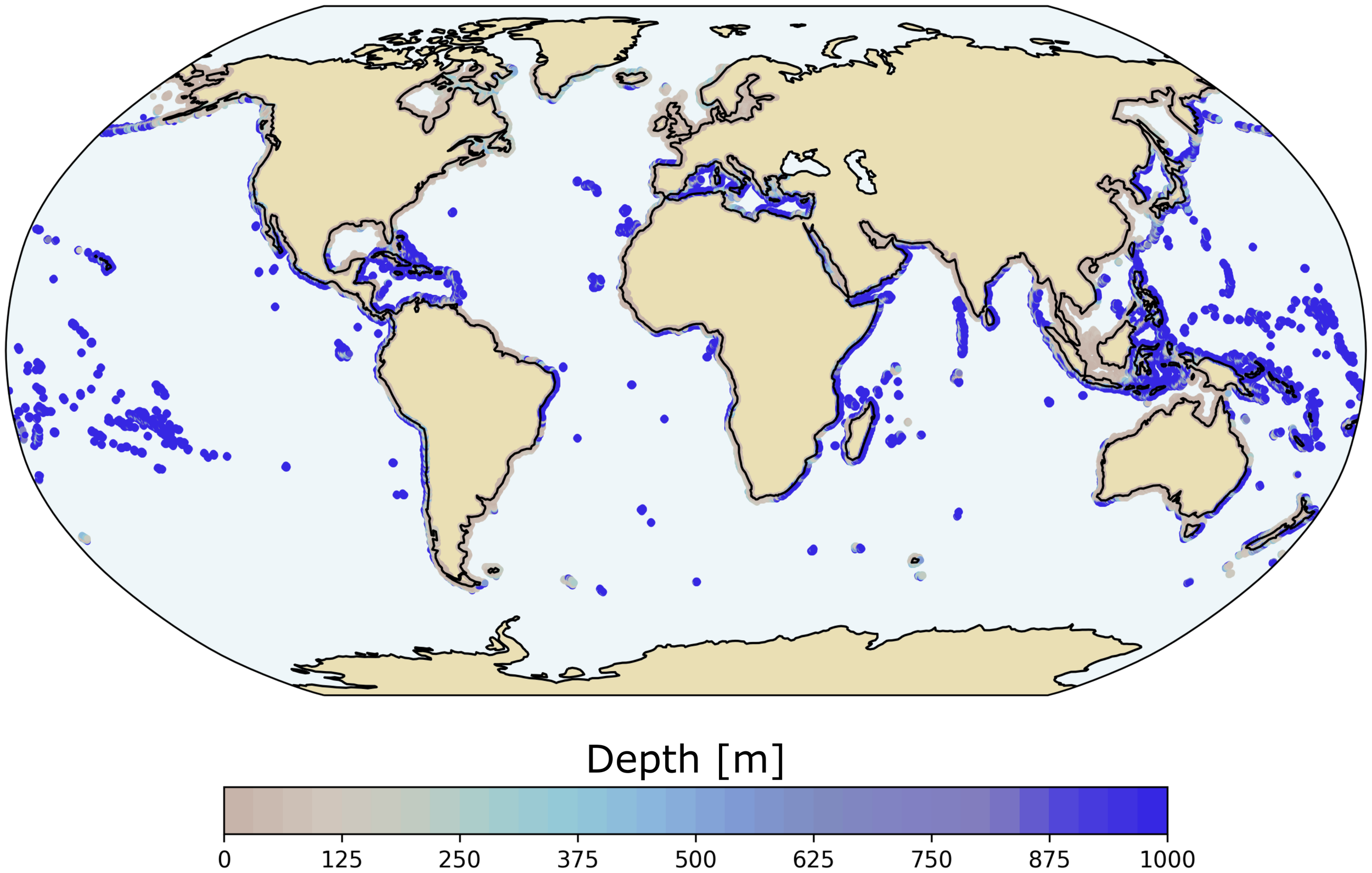 The GOW2 wave hindcast is composed of four numerical domains in a multigrid two-way nesting approach (i.e. Global, Arctic, Antarctic and Coastal domain). Spatial resolution was increased from the global (0.5°×0.5°) to a 0.25° on the coastal domain. The coastal domain includes all the grid points with depths below 200m and within 1.5 degrees distance of the islands and continental coasts. Wave attenuation produced by islands and coastal features smaller than cell size are also considered by reducing the energy flux across discrete grid cell boundaries (Tolman, 2003). Reflection of shorelines was set to 0.05 and subgrid features were also considered. Note that due to the spatial resolution of the dataset (∼25Km), localized surf processes which require higher spatial resolution are not considered. The wave spectra are defined by 24 direction bins and 32 frequencies ranging non-linearly from 0.0373 to 0.7159 Hz with each frequency being 1.1 times the previous one. Directional sectors are 15° each. The hindcast has a total of 36455 grid-points with available spectra data. We select ∼10000 locations of the coastal domain. The depth at the analyzed points ranges from 5 to 6000m. The Wave System analysis is carried out over 32 years (1989-2020) in the selected locations (Figure 1). GOW hindcast database was already used in previous studies, starting from global 60-year calibrated hindcast (Reguero et al., 2012), used in the study of Espejo et al. (2014) and Reguero et al. (2015); Reguero et al. (2019) among others. The GOW has been exhaustively validated against instrumental measurements from buoys and satellite, as described in (Mínguez et al., 2011). Perez et al. (2017) developed a second version of this global hindcast, showing a validation analysis by comparing the GOW2 outcomes against buoys and altimeter data. The two directional wave spectrum representing the typhoon Haiyan east of the Philippines on November 2014 and a bimodal spectrum of the Chilean coast in August 2015 are illustrated in Perez et al. (2017). The GOW2 hindcast database has been successfully used in previous wave climate and coastal engineering studies, such as Lobeto et al. (2021); Alvarez-Cuesta et al. (2021a), Alvarez-Cuesta et al. 2021b; Lobeto et al. (2022)); Romano-Moreno et al., 2023a; Romano-Moreno et al. (2023b)); Hegermiller et al. (2017); Weiss et al. (2020) and Camus et al. (2017).