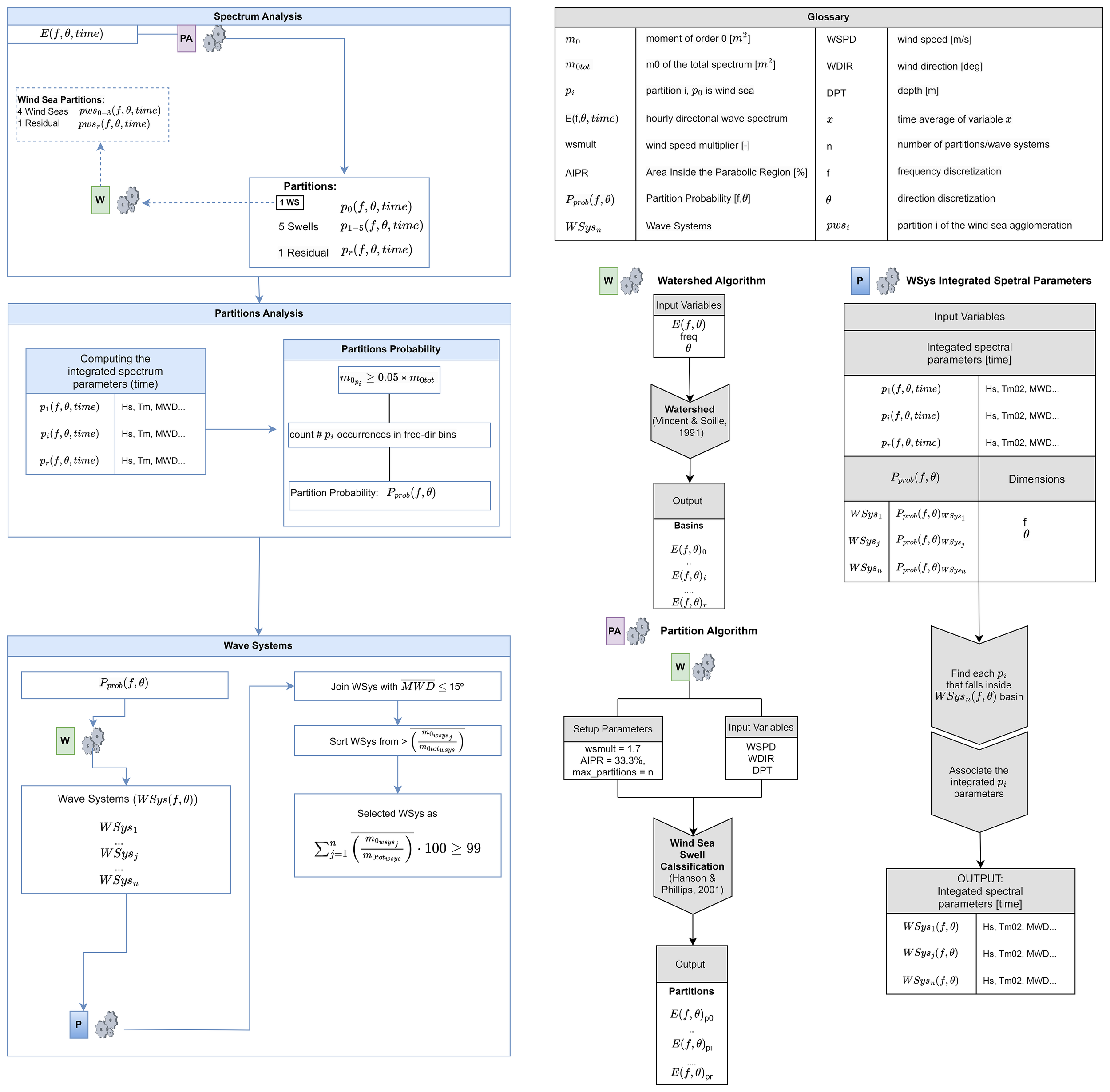 Flowchart of the methodology to find the Swell Wave Systems (WSys) (on the left in light blue), whereas on the right in grey are illustrated the glossary and under it the used algorithms.