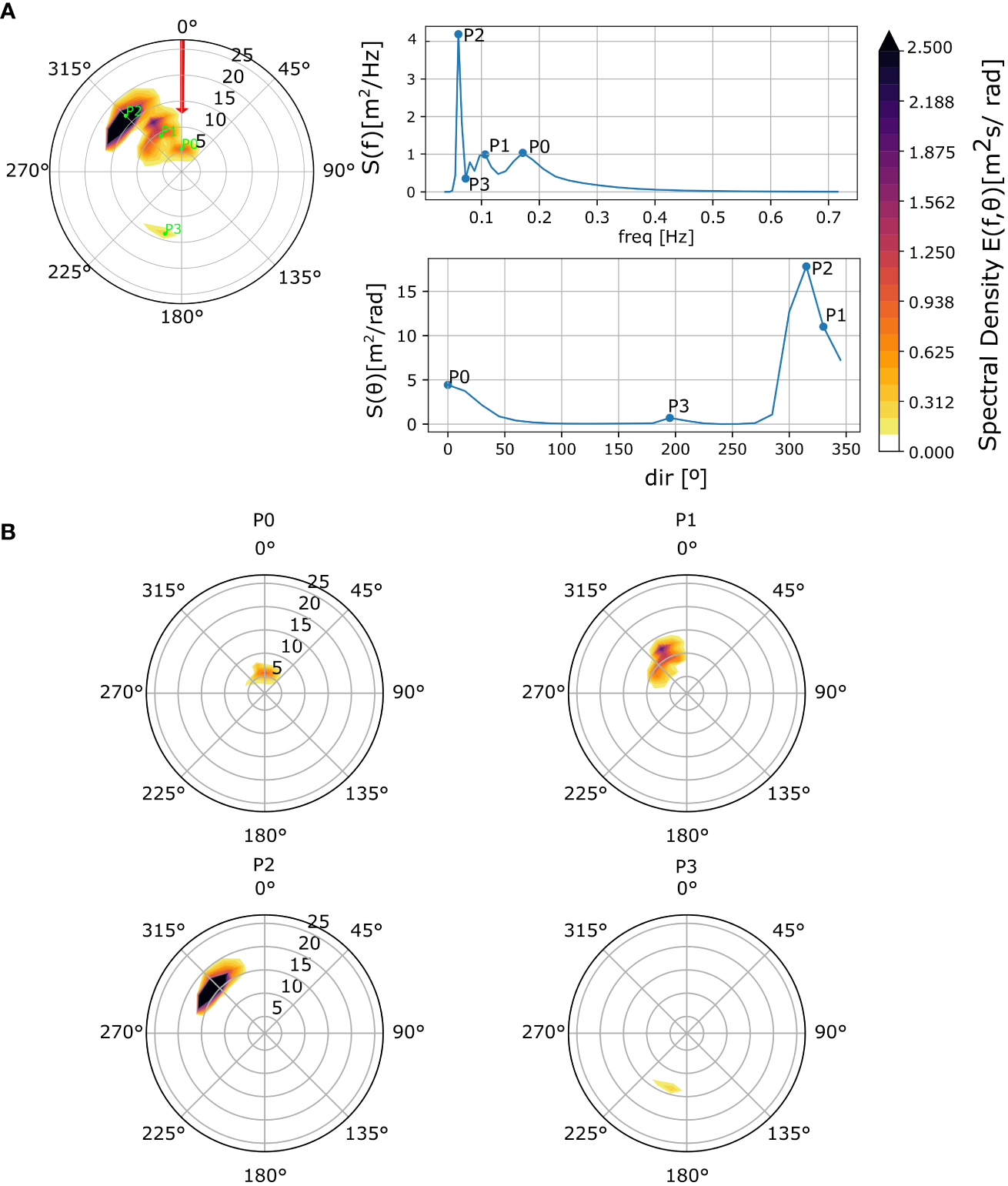 Panel (A) represents the directional wave spectrum for a specific date. The red arrow represents the wind direction. Upper right side of panel (A) shows the associated frequency spectrum and the lower panel shows the direction spectrum. Panel (B) illustrates the partitions of the directional wave spectrum at the selected time. Partition number 0 is the wind sea, while the rest are identified as swells.