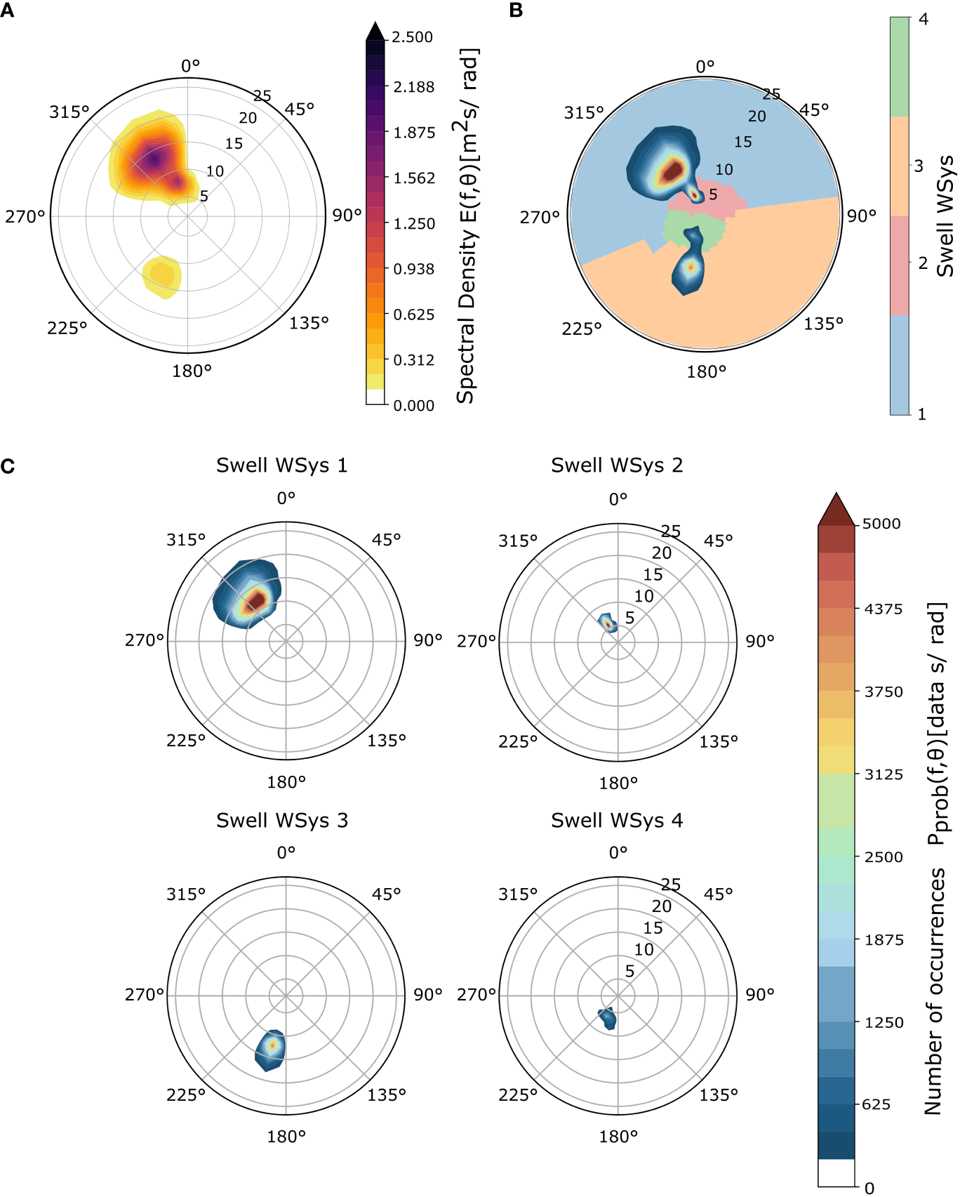 Figure 5 depicts the 32 year time averaged directional wave spectrum (panel A). The values of Pprob (number of occurrences) are shown in Figure 5B, for the total Pprob. In Figure 5C, the found four swell wave systems are depicted. The colorbar on panel a) represents the energy corresponding to the directional wave spectrum, whereas the colorbar in Figure 5B shows the watershed output, which defined the swell wave systems. The colorbar in Figure 5C depicts the number of spectral partitions of an hourly sea state that fall in a specific frequency-direction bin.