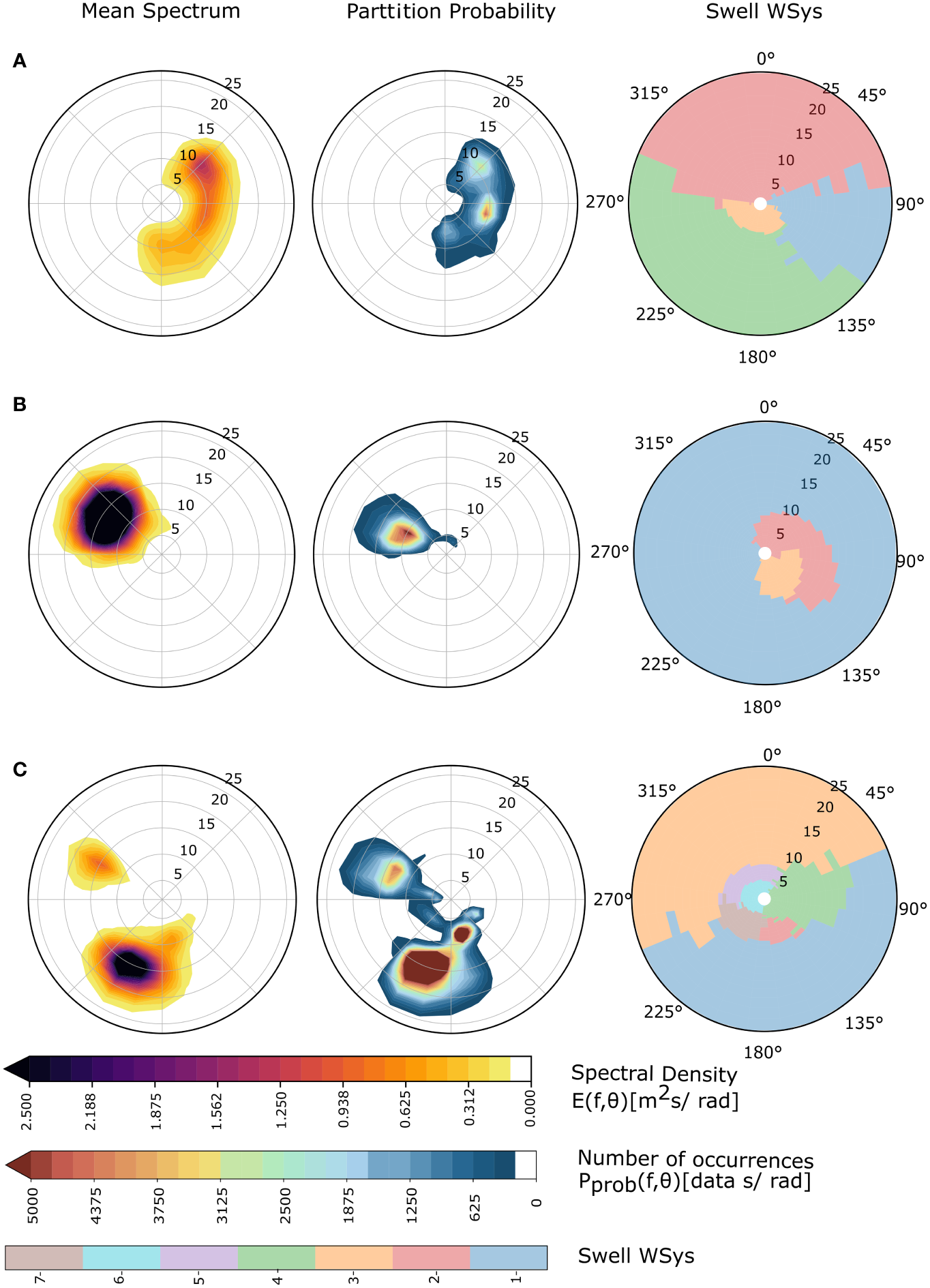 The panels of this figure are referred to the same location in Figure 4. Panel (A) illustrated the time averaged directional wave spectrum. Panel (B) depicts the Partitions Probability and the resulting four swell wave systems. Panel (C) shows each of the obtained swell wave systems.