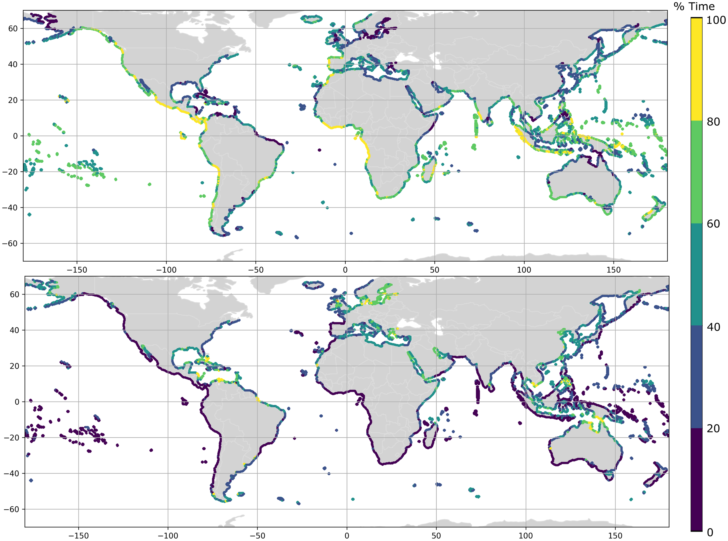 Figure 7 shows the percentage of time in which the SWs or the WS persists from the hourly data analyzed during the 32yrs historical period. The upper panel (Figure 7) shows the swell partitions, whereas, the lower panel (Figure 7) depicts the wind sea. In Figure 7 can be seen that, overall, on the West coast of the continents, the swells persist during the considered time, while on the East coast and for enclosed Seas the wind sea persists longer than the swells. On the coasts of Indonesia facing the ocean the SWs persist more than the WS, whereas, in the small enclosed region between all these islands, the wind sea and swells persist together. In the southern part of Cambodia and Vietnam, the wind sea persists more than the swells. The persistence of the wind sea is also high in the Baltic Sea, whereas in the Mediterranean Sea, the persistence of the WS is not absolute due to the fact that in this region, swells also persist during the analyzed time.