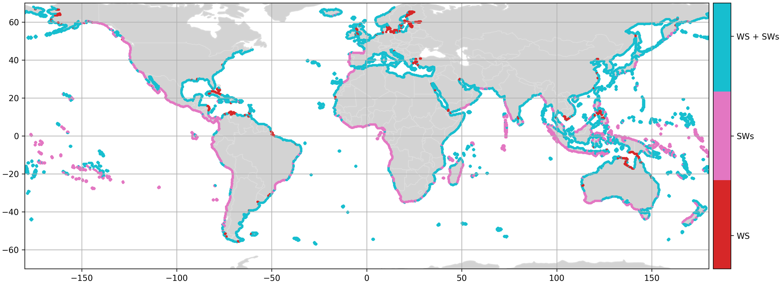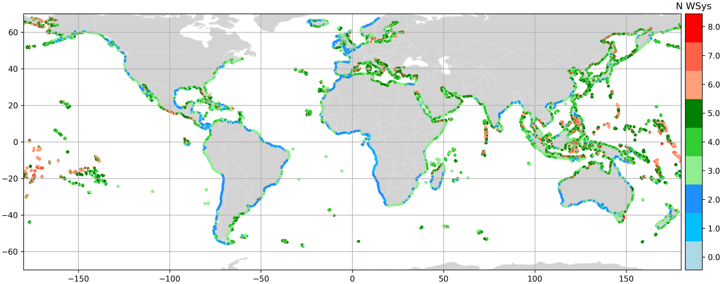 The swell wave systems provide long-term information of the frequency-direction wave energy distribution. These swell wave systems group together all the swell spectral partitions of each historical hourly sea state with similar characteristics. Thus, each swell wave system is described by a wave period and mean wave direction. In addition, the percentage of energy it represents with respect to the total spectrum can be estimated. This information is especially useful to identify those secondary swells, which can impact the coast and are usually masked by the dominant swell. The number of found significant swell wave systems, calculated using Equation 3, along the coast worldwide is displayed in the Figure 10.