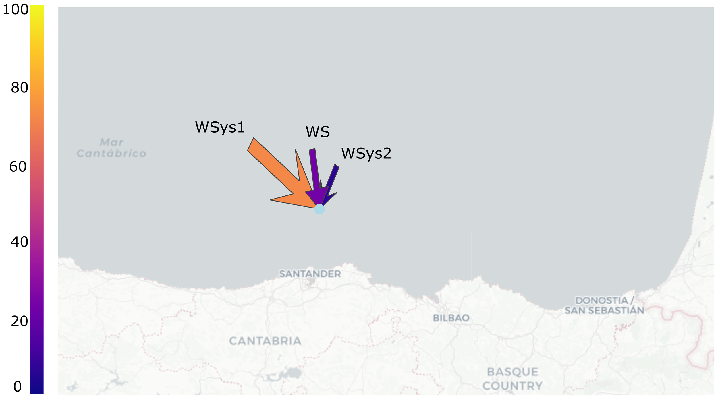 Graphical illustration of the wave systems for a single location, situated offshore of Santander, northern Spain (lat: 43.75, lon: -3.75). WSys1 corresponds to the primary swell wave system, WS is the wind sea and WSys2 is the secondary swell wave system. The size of the arrow is the mean wave period, the direction is the mean wave direction and the color represent the percentage of energy for each wave system.