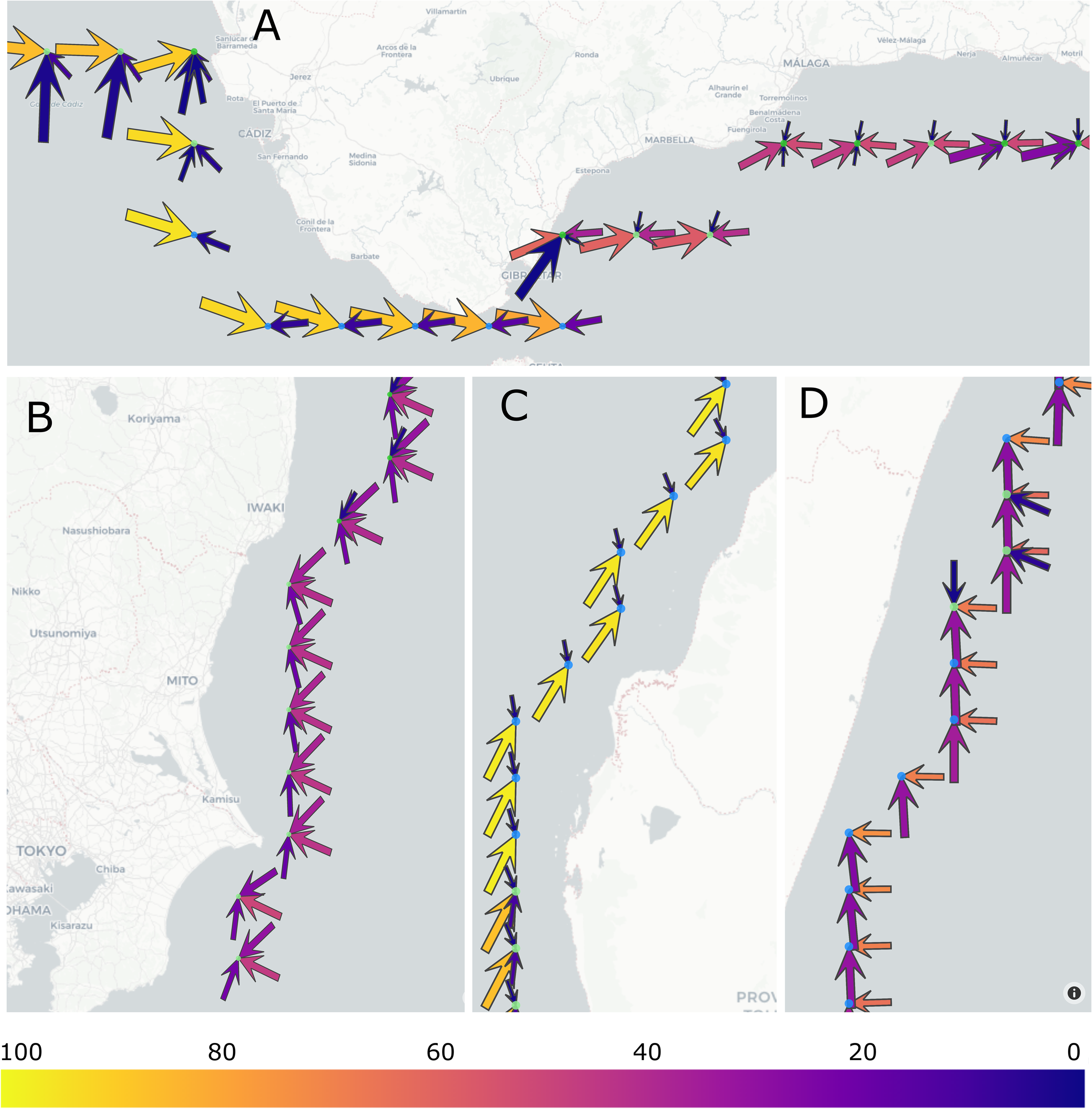 Detected swell wave systems along coastal areas. The color identifies the relative energy of each swell wave system as the percentage with respect to the total swell energy. The size of the arrow represents the mean Tp. The number of the arrows are the identified swell wave systems for each location. The direction of the arrow represent the MWD where the swell wave systems come from. Panel (A) shows the strait of Gibraltar, panel (B) the East coast of Japan, near Tokyo and panels (C) and (D) show the West and East coast of Madagascar island (between 18-22°S).