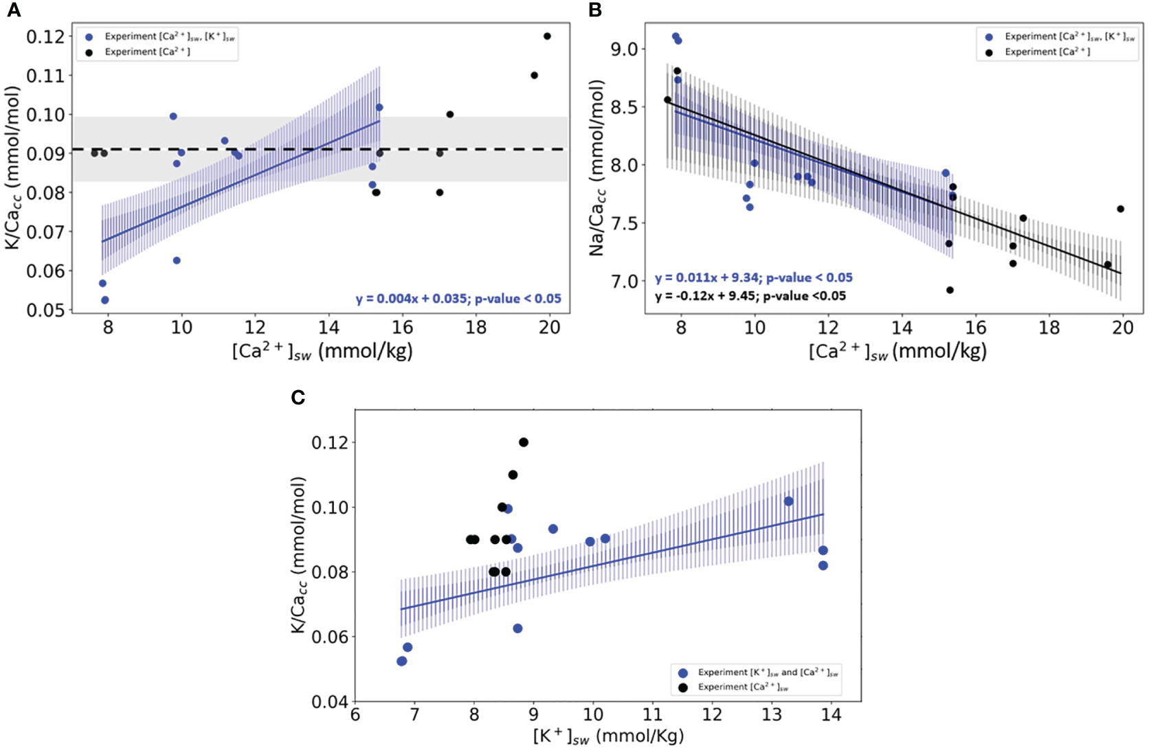 (A) K/Cacc in cultured specimens of (A) lessonii as a function of the culture’s media [Ca2+]sw. (B) Na/Cacc of the same specimens versus [Ca2+]sw. (C) K/Cacc versus [K+]sw. In panels (A, B), blue dots and lines are the results from the experiment in which both [Ca2+] and [K+] were varied. In black are the results from the experiments (Figure 1) where only [Ca2+] was varied. Lines indicate the linear correlations (both with p-values<0.05) based on the bootstrap analysis, for which the confidence intervals are added as envelopes (0.99 darker blue and 0.95 lighter shade of blue). The standard deviation for every replicate using the internal error from the SF-ICPMS was very small making it imperceptible in the plotted data (Supplementary Table S10). Panel (C) shows the same statistical analysis for both experiments axys X changes, and instead of [Ca2+]sw, the results are plotted against [K+]sw.