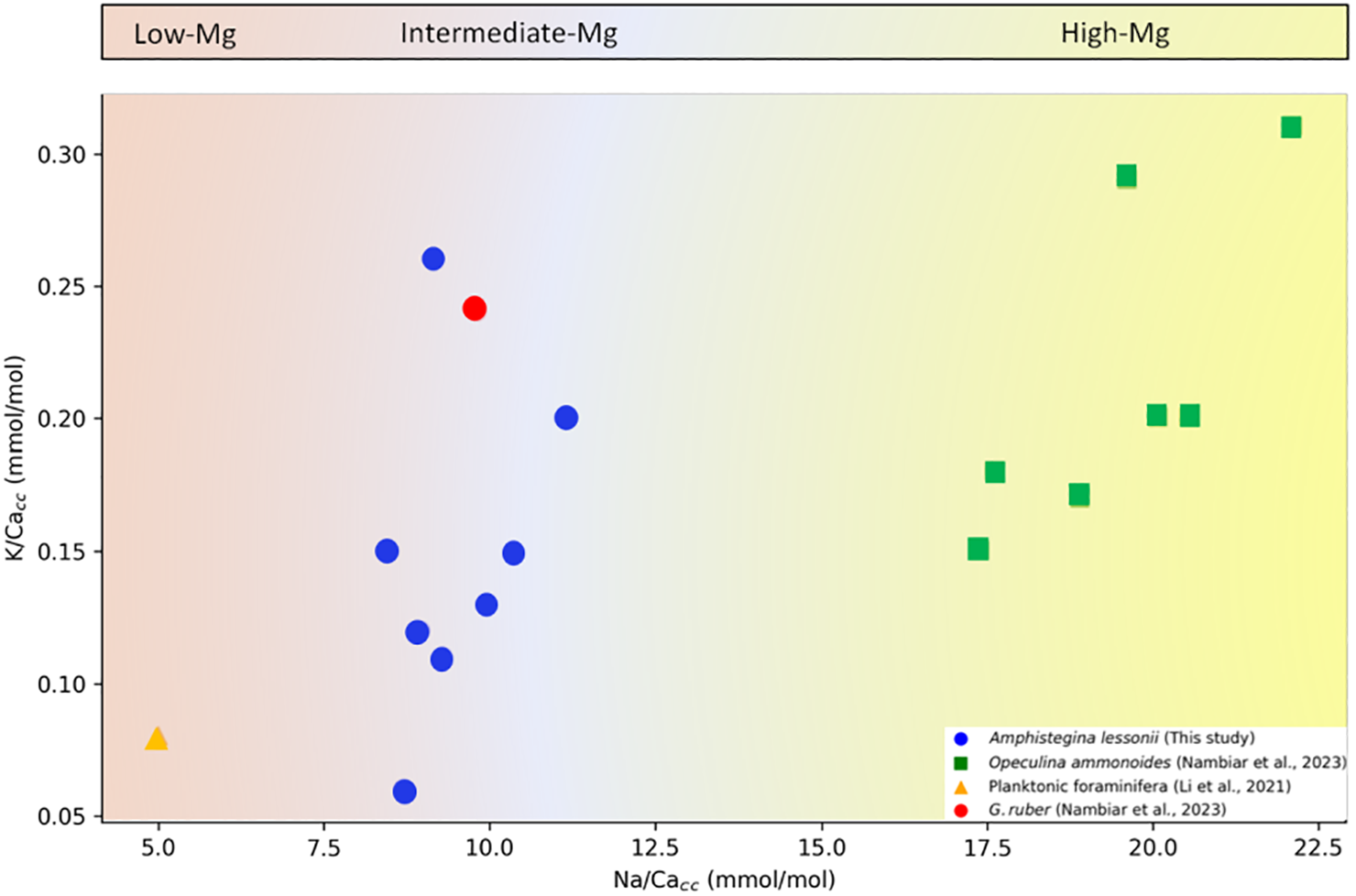 Compared to other major elements in seawater, K+ has a large ionic radius and can interfere with the structure of proteins, requiring cells to regulate the concentration of this ion. Studies looking at the impact of temperature showed no apparent effect on K/Ca in a variety of organisms (Li et al., 2021) and suggest that K-incorporation is correlated only to the concentration of K+ in the medium during inorganic precipitation experiments (Ishikawa and Ichikuni, 1984). Another very well-known monovalent ion in seawater is Na+, with an average concentration of 10.6 g/L (Duxbury et al., 2024). Na/Cacc has being studied as a proxy before for changes in salinity in the past (Wit et al., 2013; Geerken et al., 2018), although this was debated to be the case by Hauzer et al. (2021). In addition, there is no effect of temperature on Na-incorporation (Allen et al., 2016).
