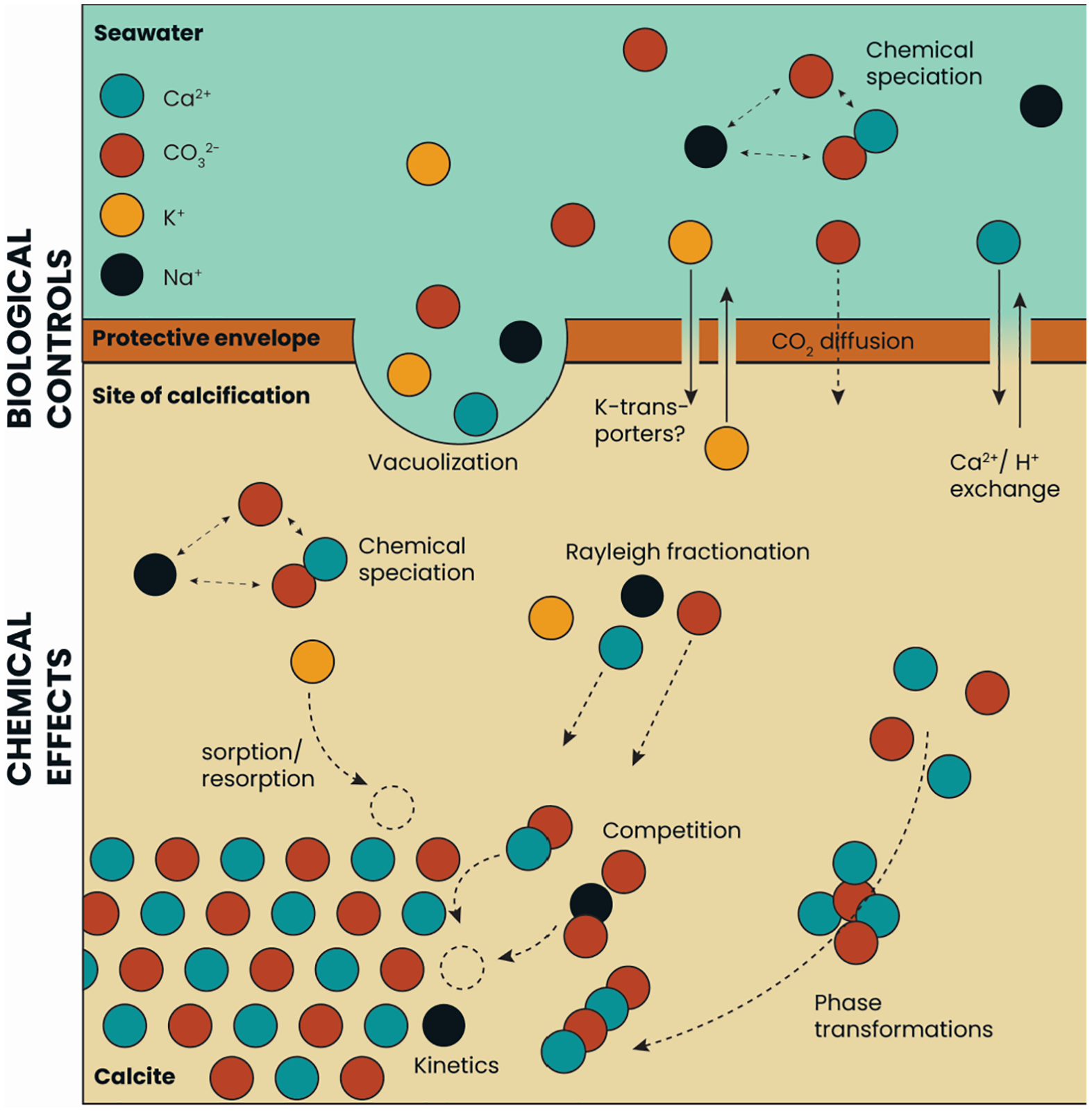Incorporation of monovalent cations and whether these elements are affected by the so-called vital effects of foraminifera remain largely unknown. Incorporation of K+ by skeleton of corals has been shown to be related to incorporation of Na+ and explains the similarity in the way they are incorporated (Mitsuguchi and Kawakami, 2012). Moreover, using the incorporation of divalent cations such as Mg2+ and Sr2+ as proxies also requires known sea water element to calcium ratios, which is on geological time scales can rely on changes in seawater [Ca2+]. It is also vital to understand the inter-species’ effect of environmental parameters on element incorporation. Finally, it is necessary to quantify the interaction between incorporated ions, for example Na+ and K+, to correct fossil El/Ca for changes in the composition of the seawater’s major ion inventory.
