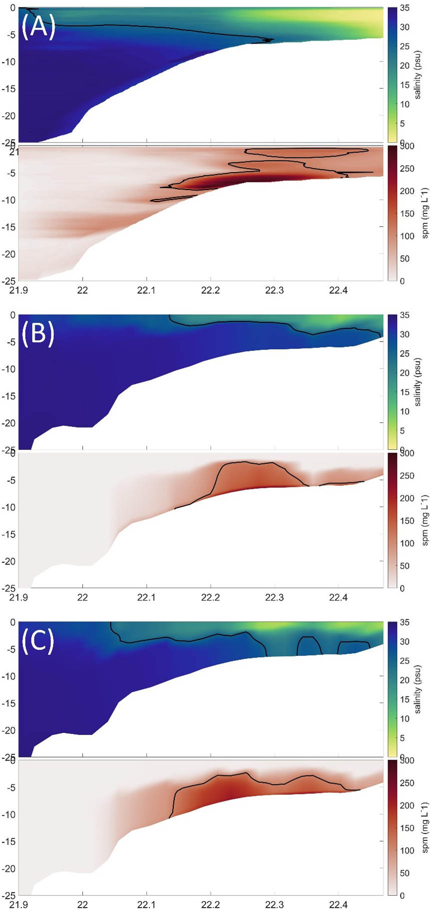The distribution of sanility and SPM concentration along a transect in Lingding Bay. (A) Observed distribution of SPM concentration along the transect (during July 2020) by Cui et al., (2022). (B) and (C) snapshots of model results during a tidal cycle in the same day. The contour line of salinity of 25 psu and SPM concentration of 110 mg L-1 was marked by the black line in respective plots.