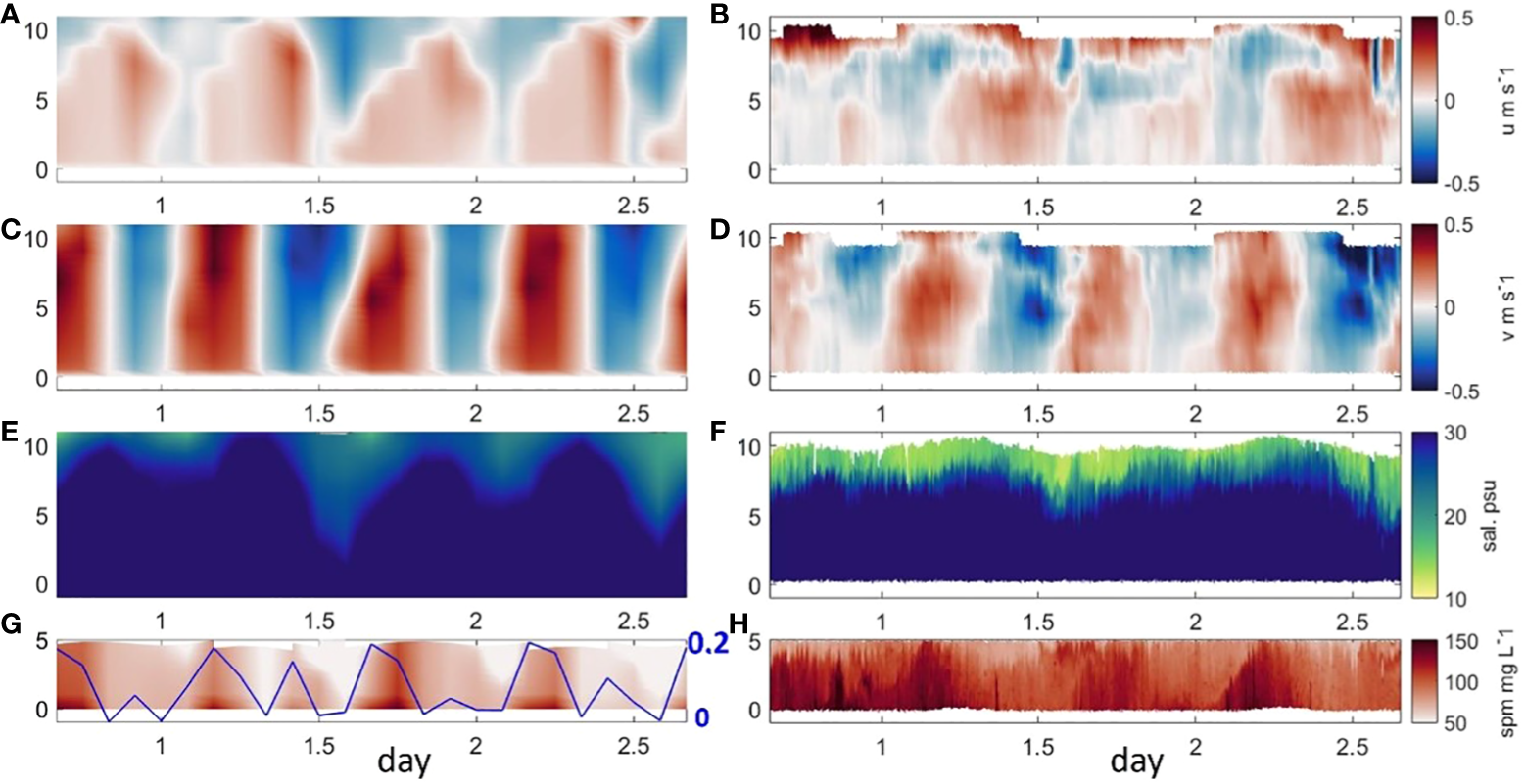 Vertical distribution of (A, B) eastward velocity u, (C, D) northward velocity v, (E, F) salinity, (G, H) SPM concentration at S site. The left panel is model result, and the right panel is observation data derived from (Cui et al., 2022). The solid line in (G) indicates simulated bed shear stress with axis on the right (unit: Pa).