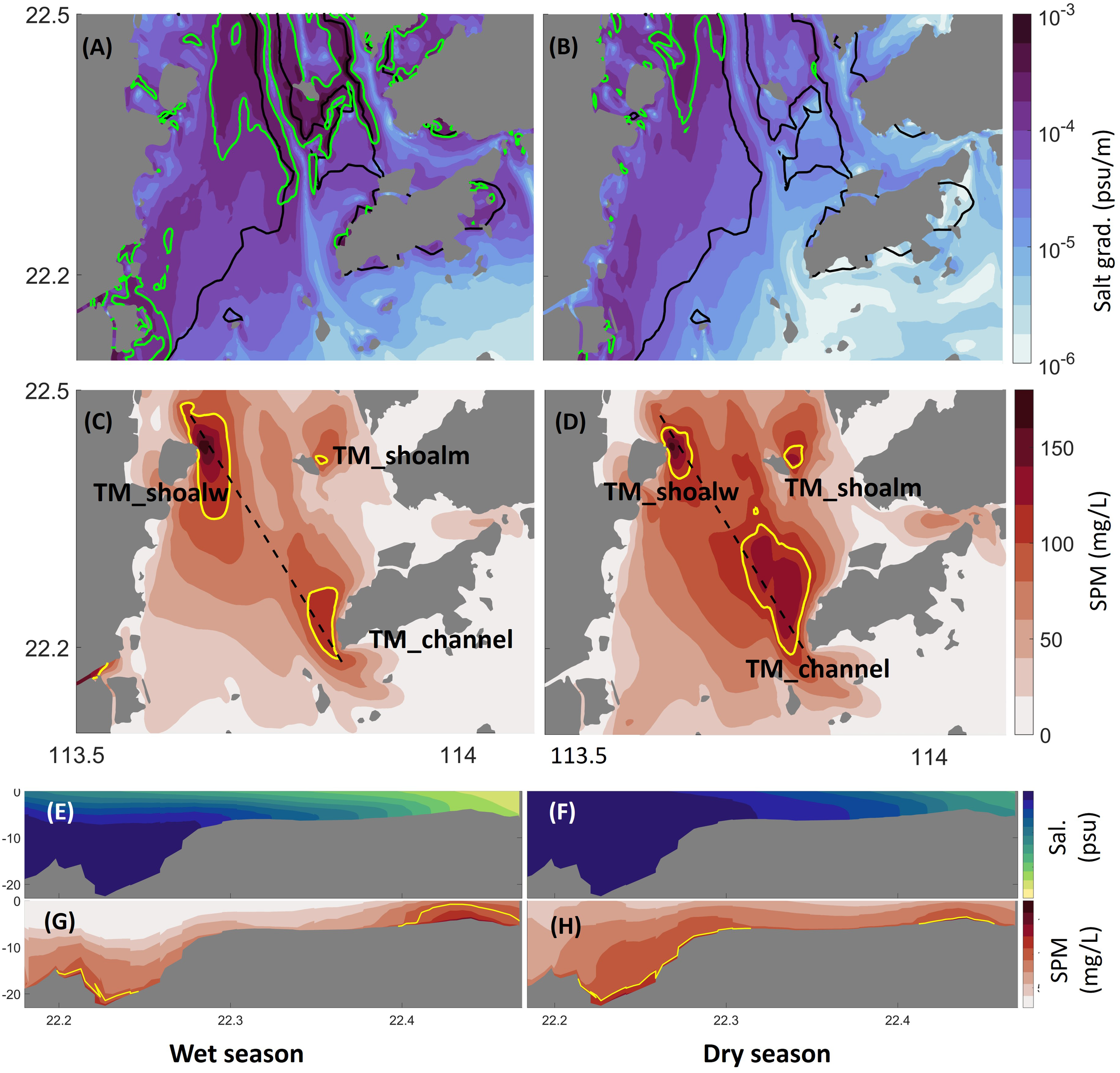 (A, B) Horizontal bottom water salinity gradient in the wet and dry seasons, respectively. The green line depicts the estuarine front according to Ma et al. (2023), and the green line marks the 7-m isobaths. (C, D) Seasonal average SSC in the bottom layer in the wet and dry seasons, respectively. The yellow lines mark the 100mg L-1 contours, and the dashed black line marks the transect which is plotted in (E–H). (E, G) show the distribution of salinity and SSC along the transect in the wet season, respectively. (F, H) are for the same parameters but for the dry season.