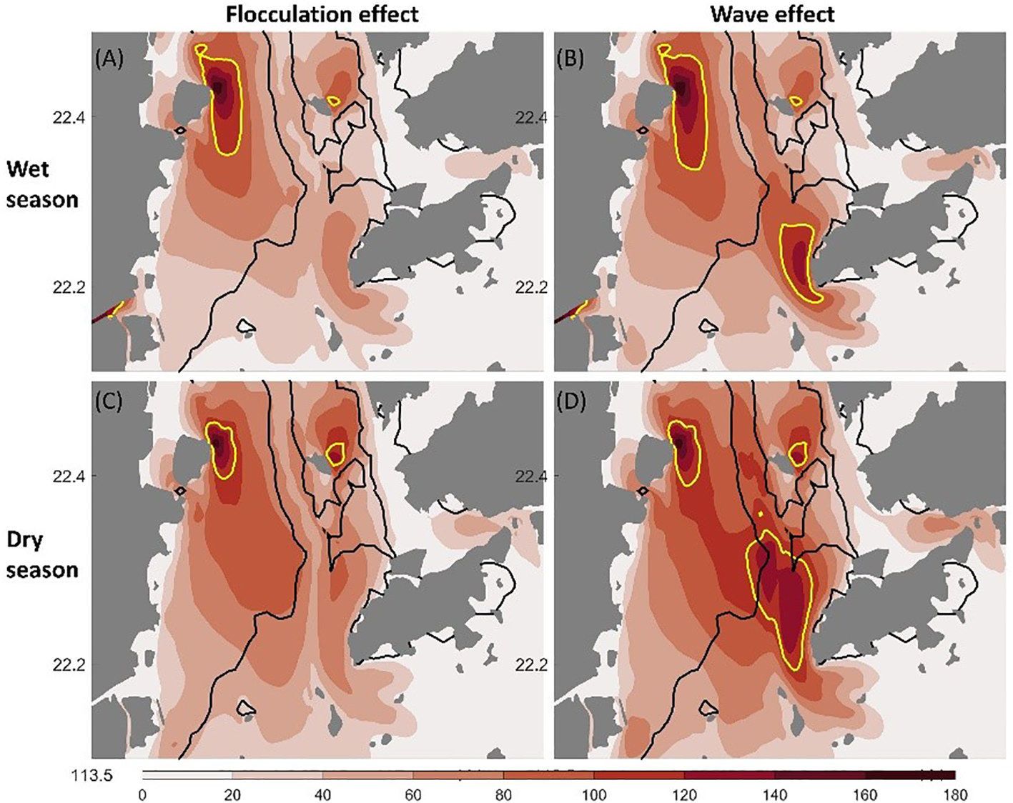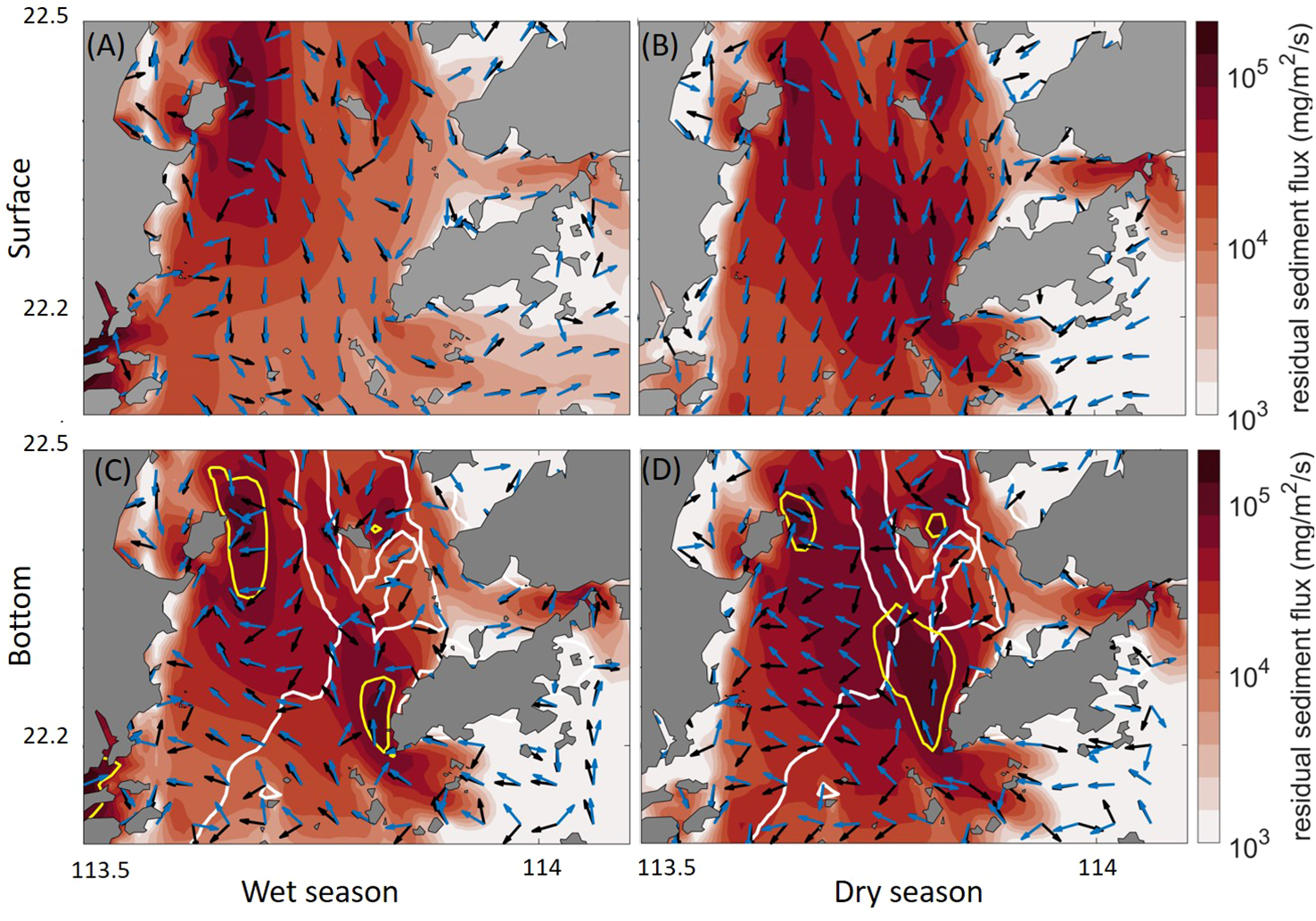 Residual current direction (blue arrows) and sediment transport flux (direction indicated by black arrows and magnitude indicated by the color) in the surface (A, B) and bottom layers (C, D). (A, C) are for the wet season, whilst (B, D) are for the dry season. ETMs are indicated by the yellow lines in the bottom layer. The white line refers to the 7 m-isobaths.