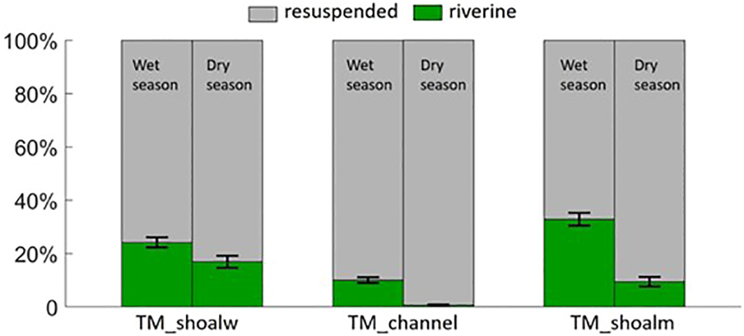 In the TM_channel, the average SSC is 120 mg L-1 and 133 mg L-1 during the wet and dry seasons, respectively. The lower SSC in the TM_channel than in the TM_shoalw is due to the smaller fraction of silt in the channel which serves as the main source of SPM. An enhanced stratification occurs in the channel area in the wet season (Figure 6), which is induced by the extensive river plume that suppresses the saline water to the channel (Ma et al., 2023). The stratification reduces turbulence greatly, resulting in lower SSC in the TM_channel in the wet season compared to the dry season (Figure 6). The stratification also affects the spatial extent of the TM_channel. In the wet season, the TM_channel is mainly restricted to the deeper channel, whereas it extends upstream and to the shoals during the dry season. This pattern is clearly different from the TM_shoalw, which shrinks in the dry season.