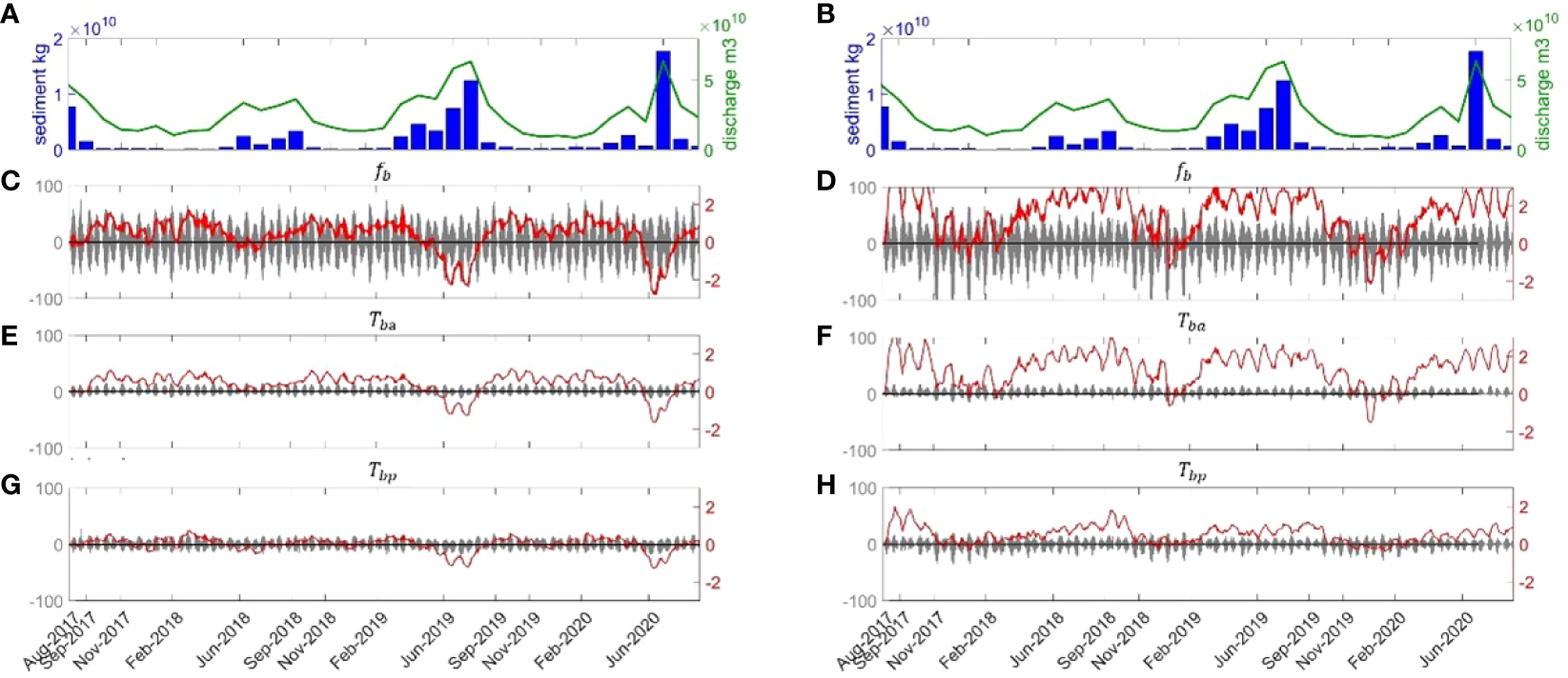 In Equation 8, the brackets 〈 〉 indicate the tidally averaged value, while the over bar symbol denotes the vertical average value. refers to the mean advective flux, accounts for the transport by stokes’ drift related to tides wave, and are the tidal pumping terms that arise from the phase lag between variables related to the tidal cycle, with negative values corresponding to the phase lag between variables beyond , refer to the vertical gravitational circulation related to the estuarine exchange flow and the change of water depth partly caused by sediment scouring and settling, respectively.