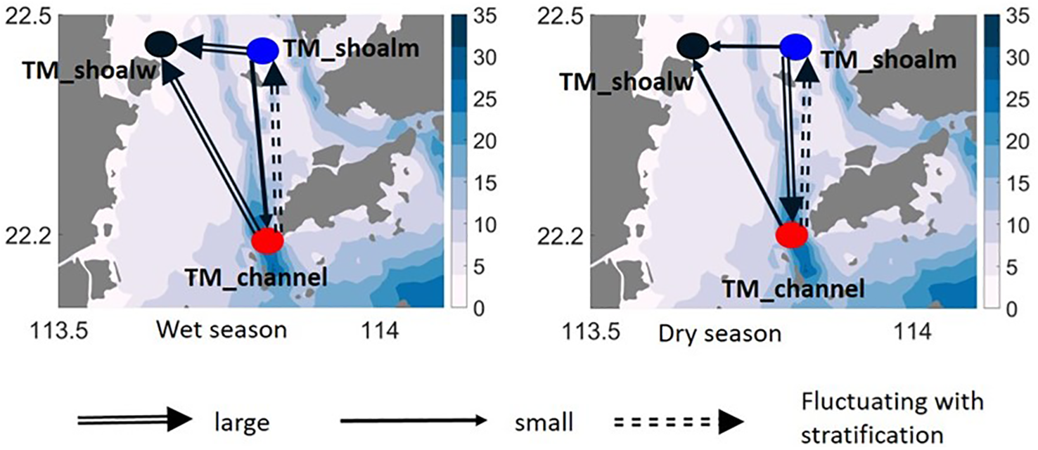 Our simulation results show that the physical mechanisms for the formation of the TM_shoalw and TM_shoalm show high similarity (Supplementary Figures S2, S3). These two ETMs are both formed by the convergence of SPM delivered by fresh riverine water and saline oceanic water. The formation of the TM_channel is driven by a different mechanism compared to the other two. The location of the nucleus of the ETMs remains relatively stable, despite that they exhibit different extension and SSC between wet and dry seasons. To avoid redundant process descriptions, we focus on the elucidation of the TM_shoalw (which shares similarity with the TM_shoalm) and the TM_channel.