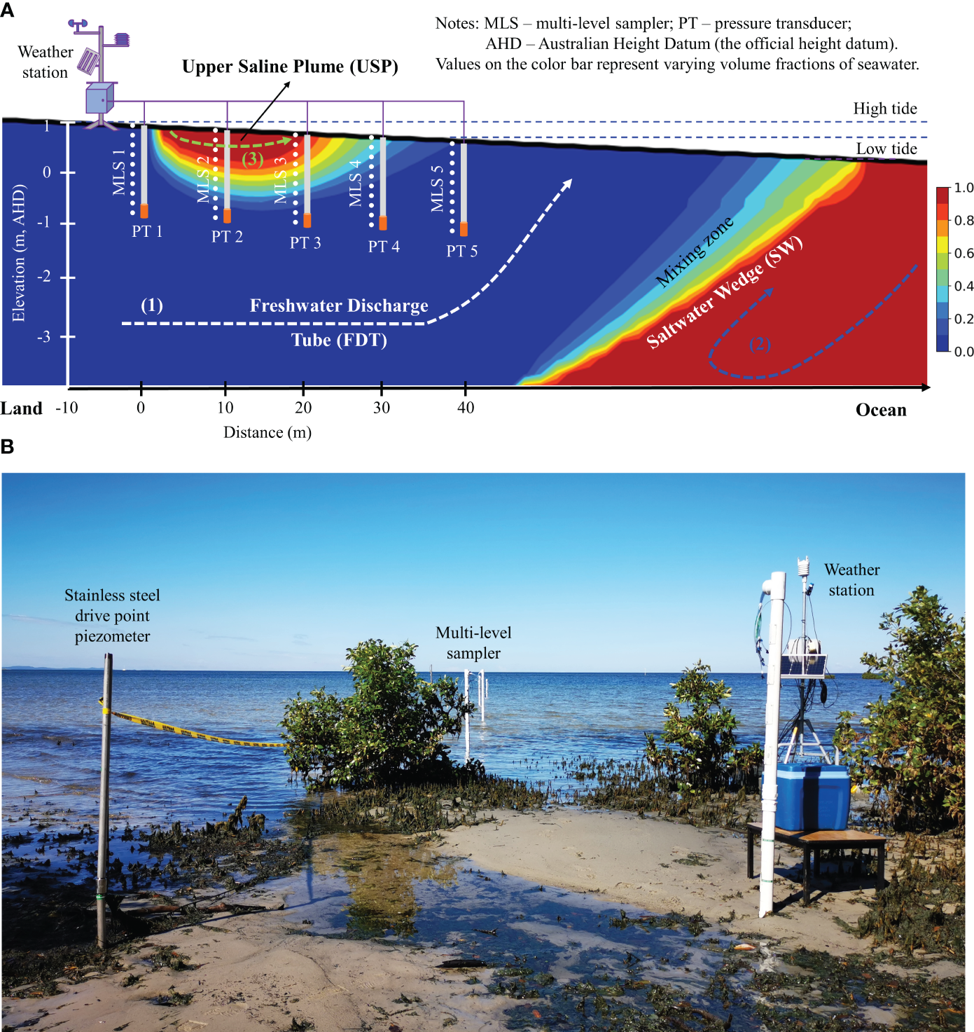 (A) Schematic diagram of field experimental setup in a coastal groundwater system. The bold black line is the beach profile. The horizontal direction represents the beach transect toward the ocean, and the vertical direction represents the elevation relative to the Australia Height Datum (AHD) which is the official height datum for Australia. As shown in the color bar, red indicates pure seawater with a volume fraction of 1.0, while blue represents pure fresh groundwater with a volume fraction of 0.0. In between the two is the mixing zone with varying volume fractions of seawater. The major processes in the intertidal area include (1) fresh groundwater discharge (shown as a white dashed line), (2) density-driven circulation (shown as a blue dashed line), and (3) tide-induced circulation (shown as a green dashed line). Between the saltwater wedge (SW) and the upper saline plume (USP), a freshwater discharge tube (FDT) intersects the beach. (B) Snapshot of field experimental setup along the beach transect in the intertidal area at Sandstone Point, Southeast Queensland, Australia. The field instruments included a solar-powered weather station, five multi-level samplers (MLS), and five drive point piezometers (equipped with pressure transducers (PT)) which were installed at 10-m intervals along the beach transect.