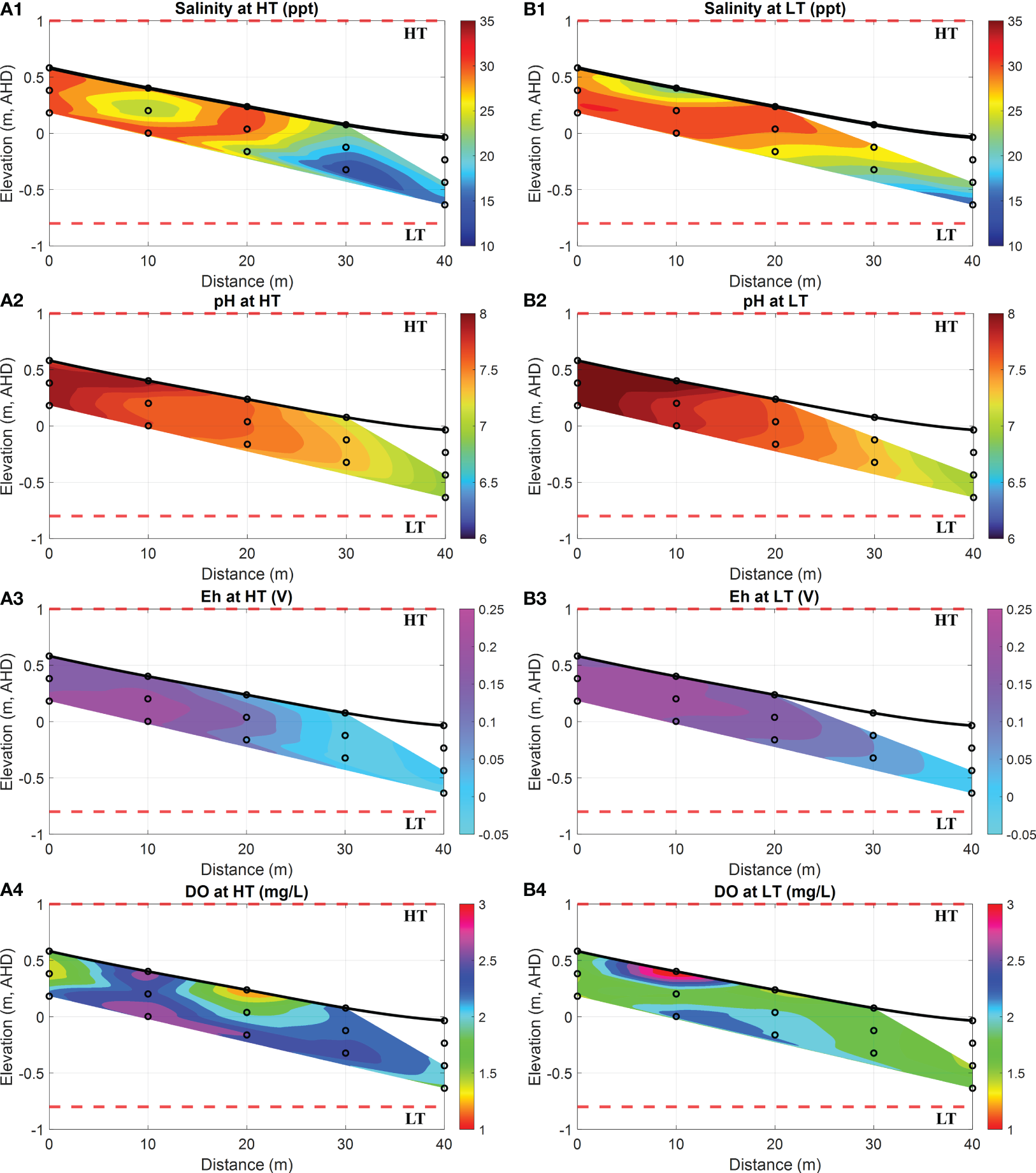 Spatial distribution of salinity, pH, Eh, and DO at HT and LT in the intertidal area. (A1-A4) show the salinity (in ppt, equivalent to g/kg), pH, Eh (in Volts) and DO (in mg/L) levels at HT, while (B1-B4) represent the salinity (in ppt, equivalent to g/kg), pH, Eh (in Volts) and DO (in mg/L) at LT. In addition, the bold black line is the beach profile, and the black circles represent the sampling points. The red dashed lines represent the HT and LT elevations in relation to the Australian Height Datum (AHD) which is the official vertical datum for Australia. The horizontal represents the distance towards the ocean, and the vertical represents the elevation relative to AHD.