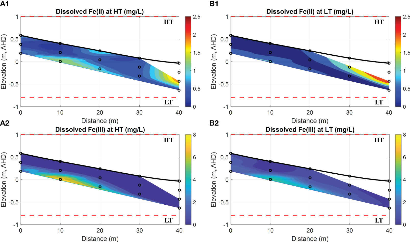Spatial distribution of dissolved Fe(II) and Fe(III) at HT and LT in the intertidal area. (A1,A2) show the dissolved Fe(II) and Fe(III) (both in mg/L) at HT, respectively, while (B1, B2) represent the dissolved Fe(II) and Fe(III) (both in mg/L) at LT, respectively. In addition, the bold black line is the beach profile, and the black circles represent the sampling points. The red dashed lines represent the HT and LT elevations in relation to the Australian Height Datum (AHD) which is the official vertical datum for Australia. The horizontal represents the distance towards the ocean, and the vertical represents the elevation relative to AHD.